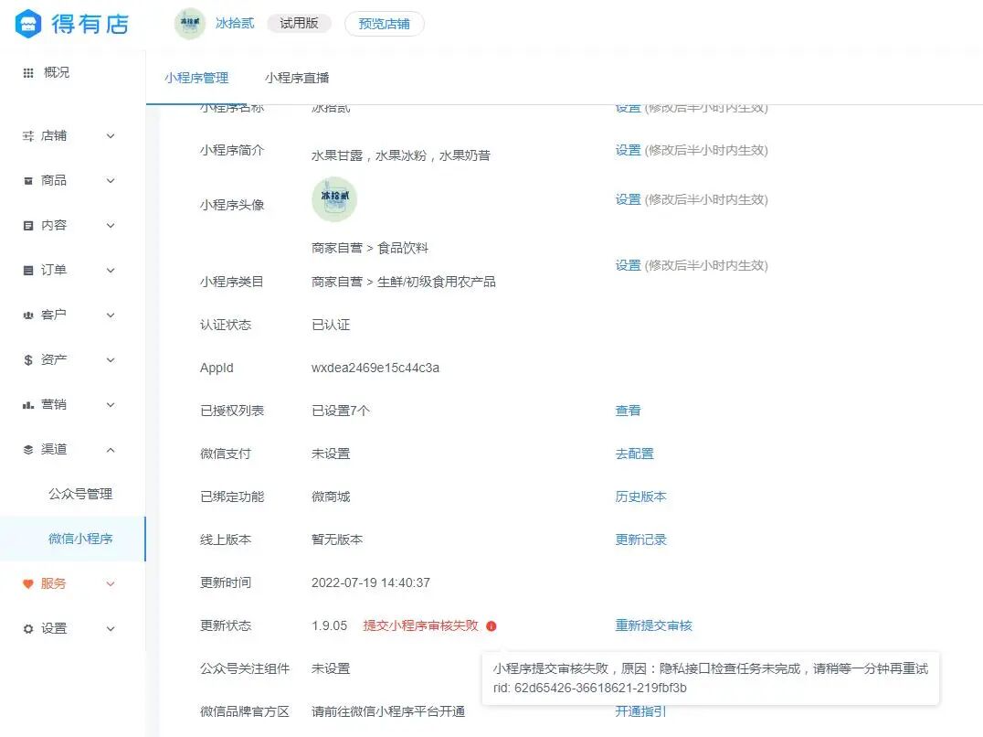 小程序授权给第三方提交发布,第三方技术已经调整好隐私设置,多次发布被驳回,原因说“隐私接口检查任务未完成,请稍等一分钟再重试 rid: 62d65426-36618621-219fbf3b”,是什么原因呢,还是要设置什么吗