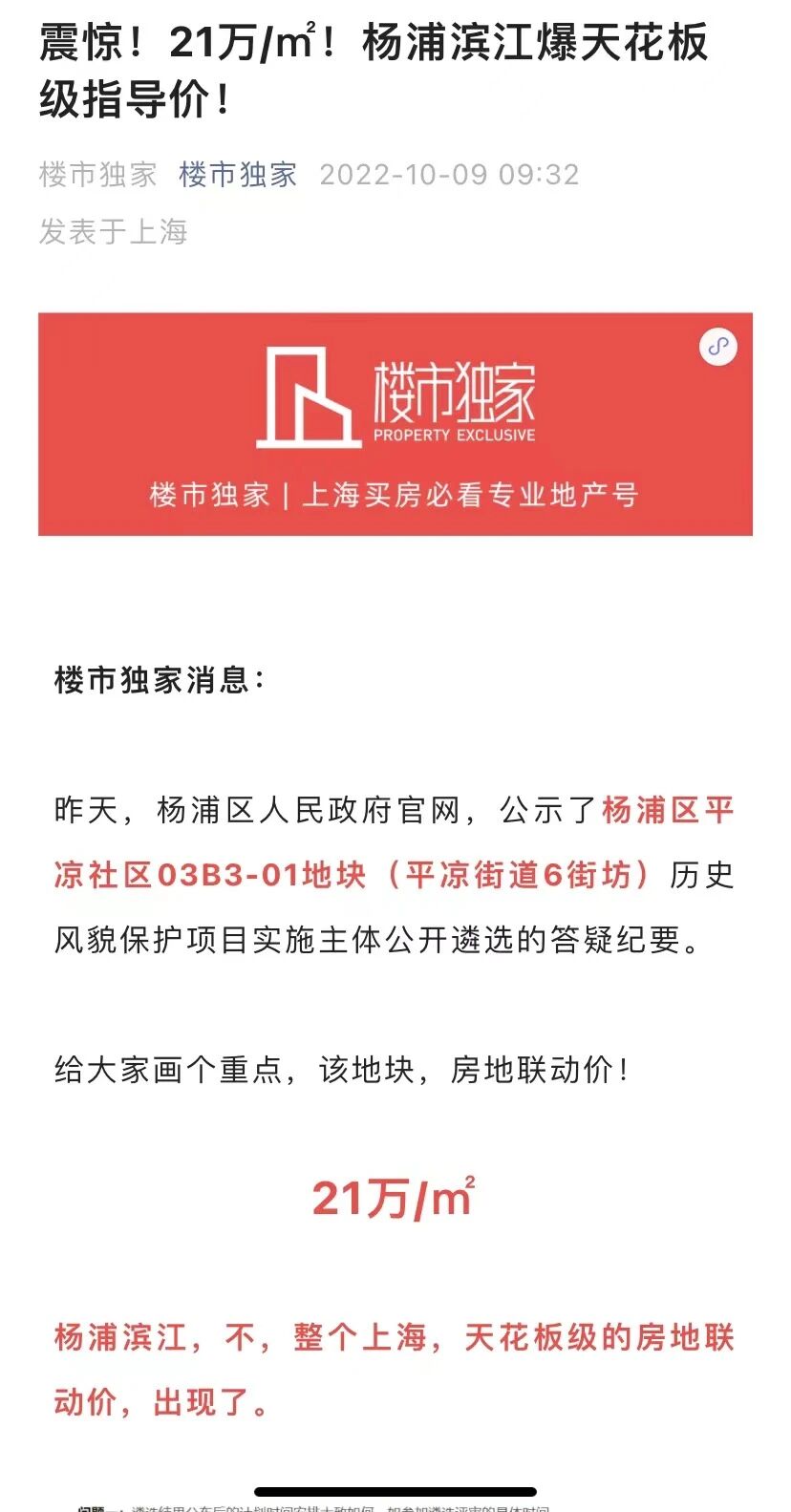 (1)文章标题:震惊!21万/㎡!杨浦滨江爆天花板级指导价!