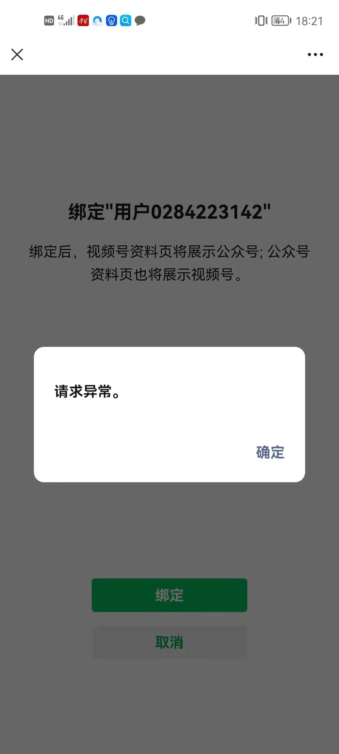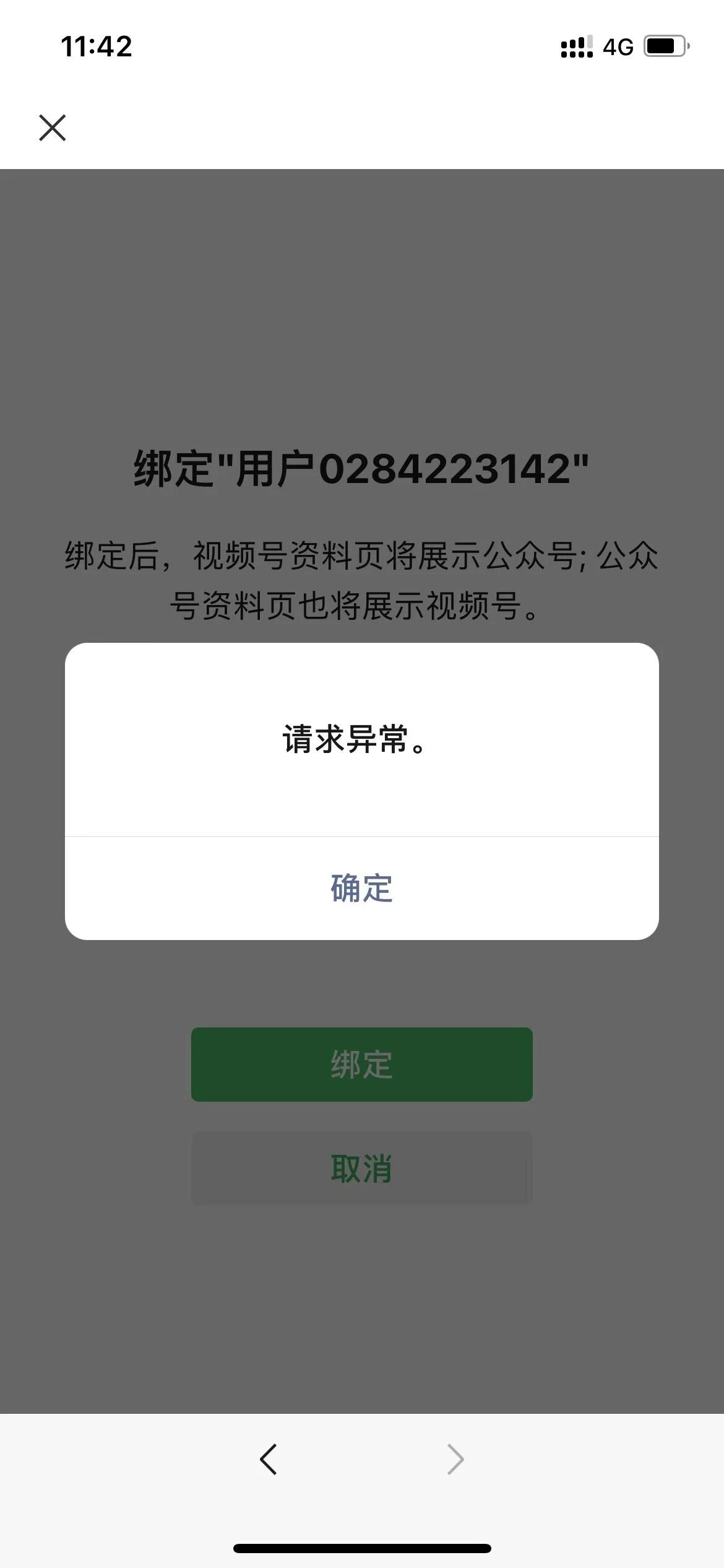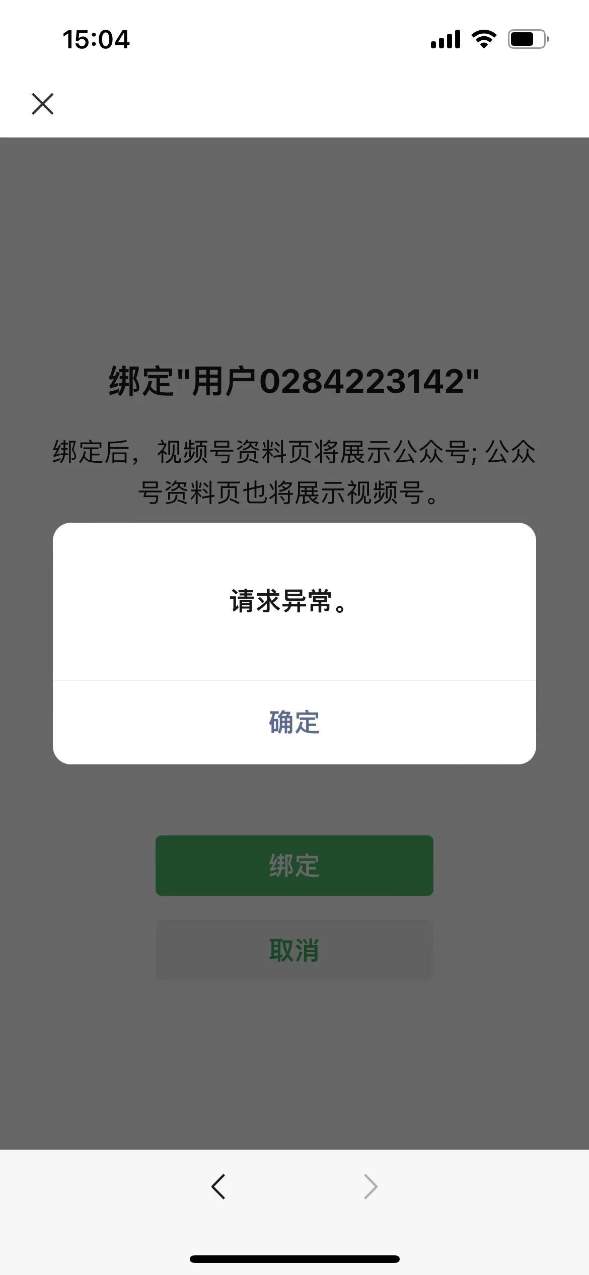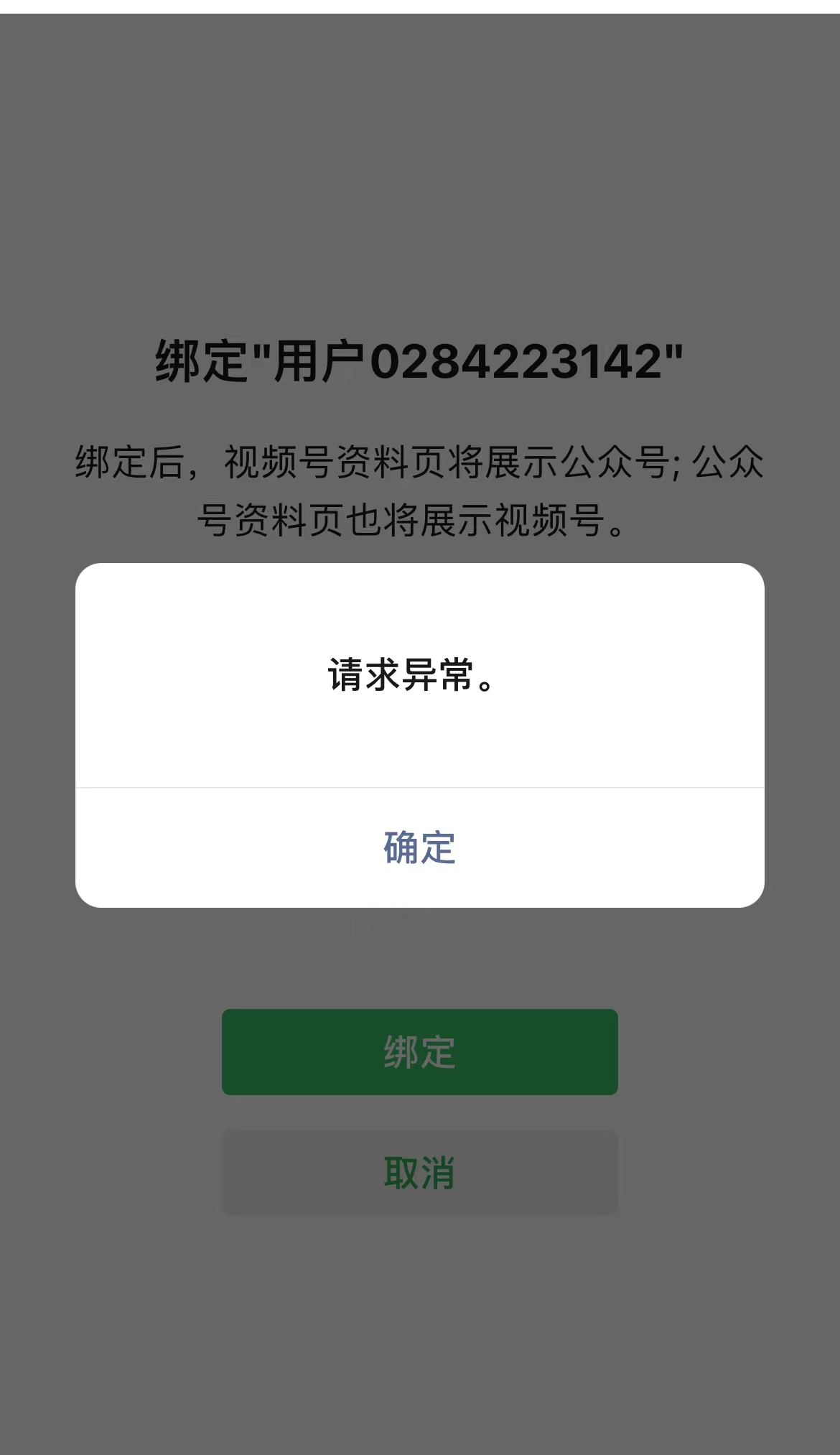 5. 问题描述:公众号绑定视频号的过程中,显示“请求异常”