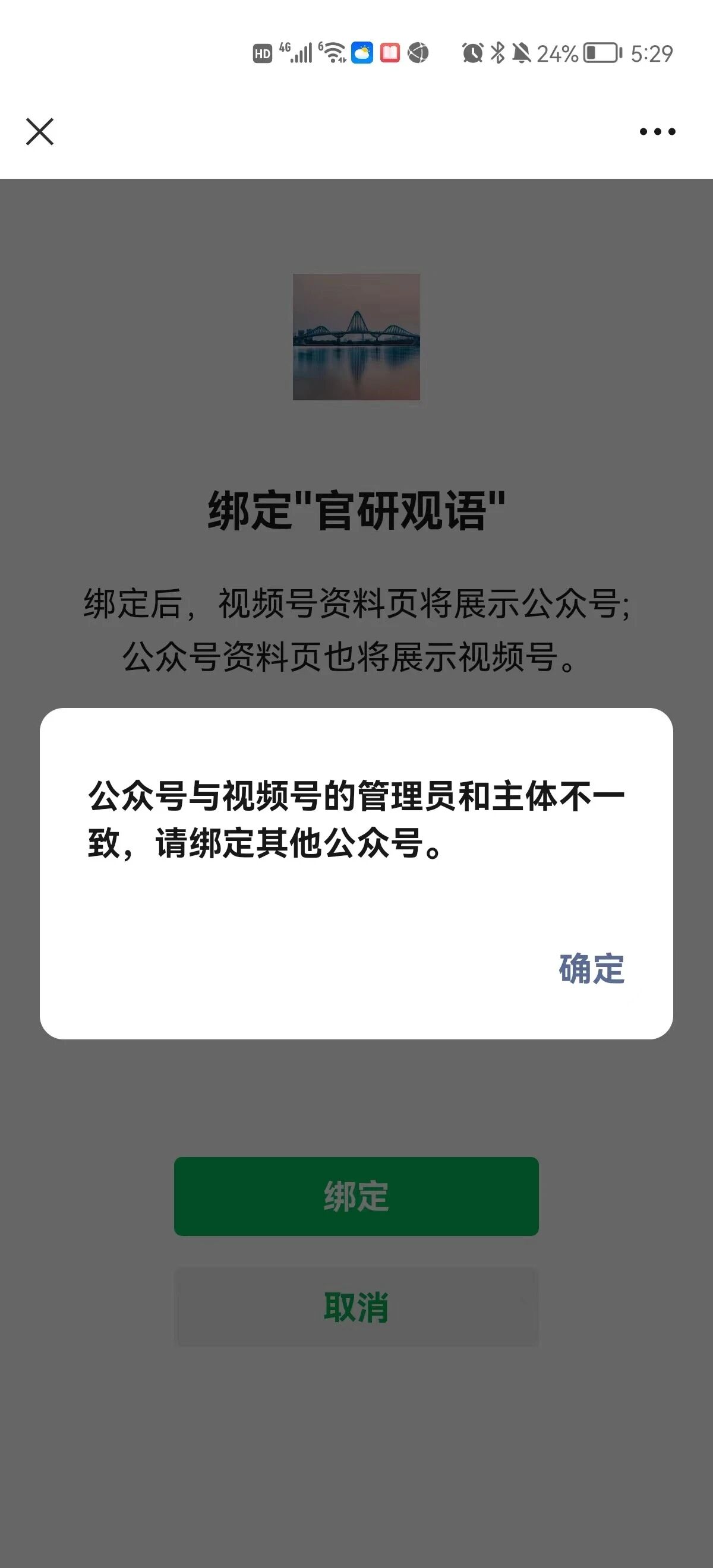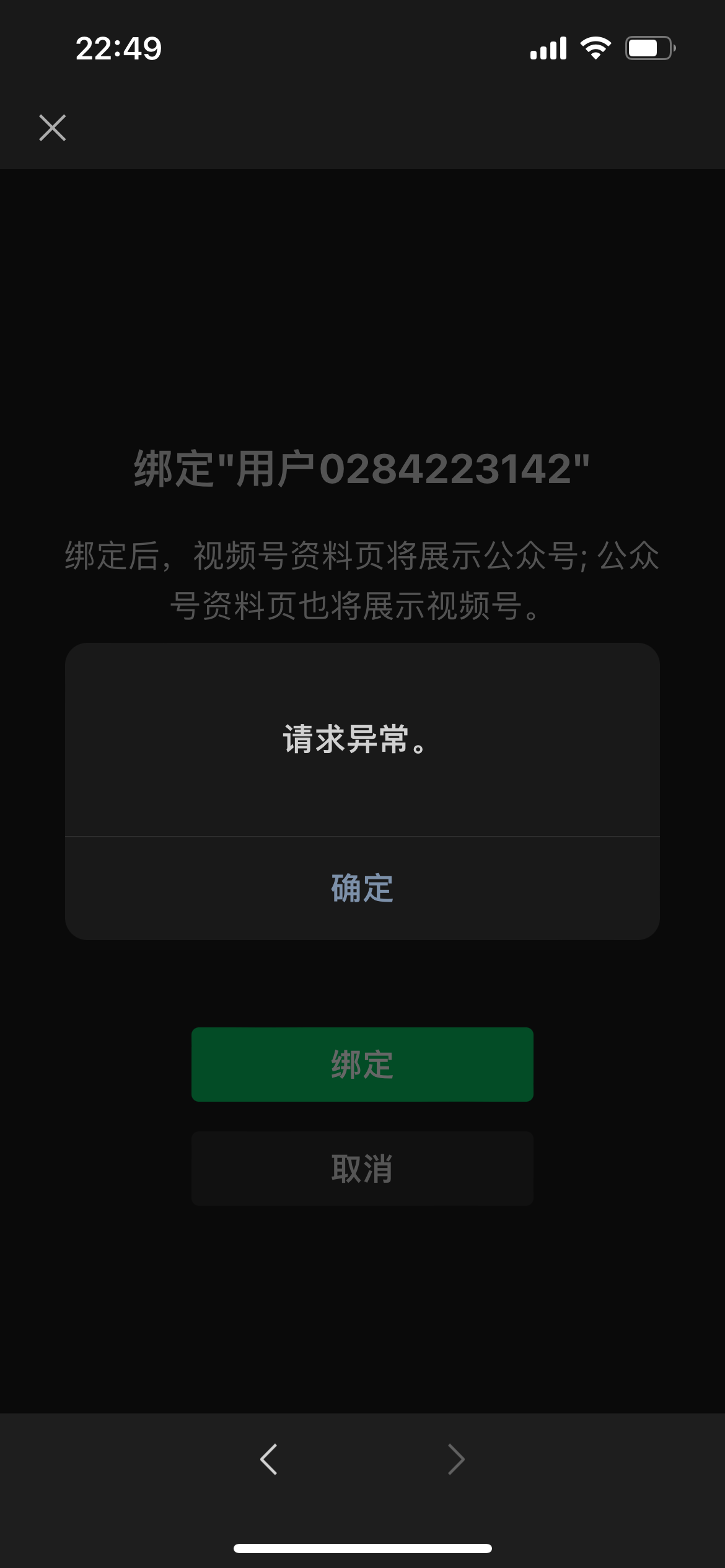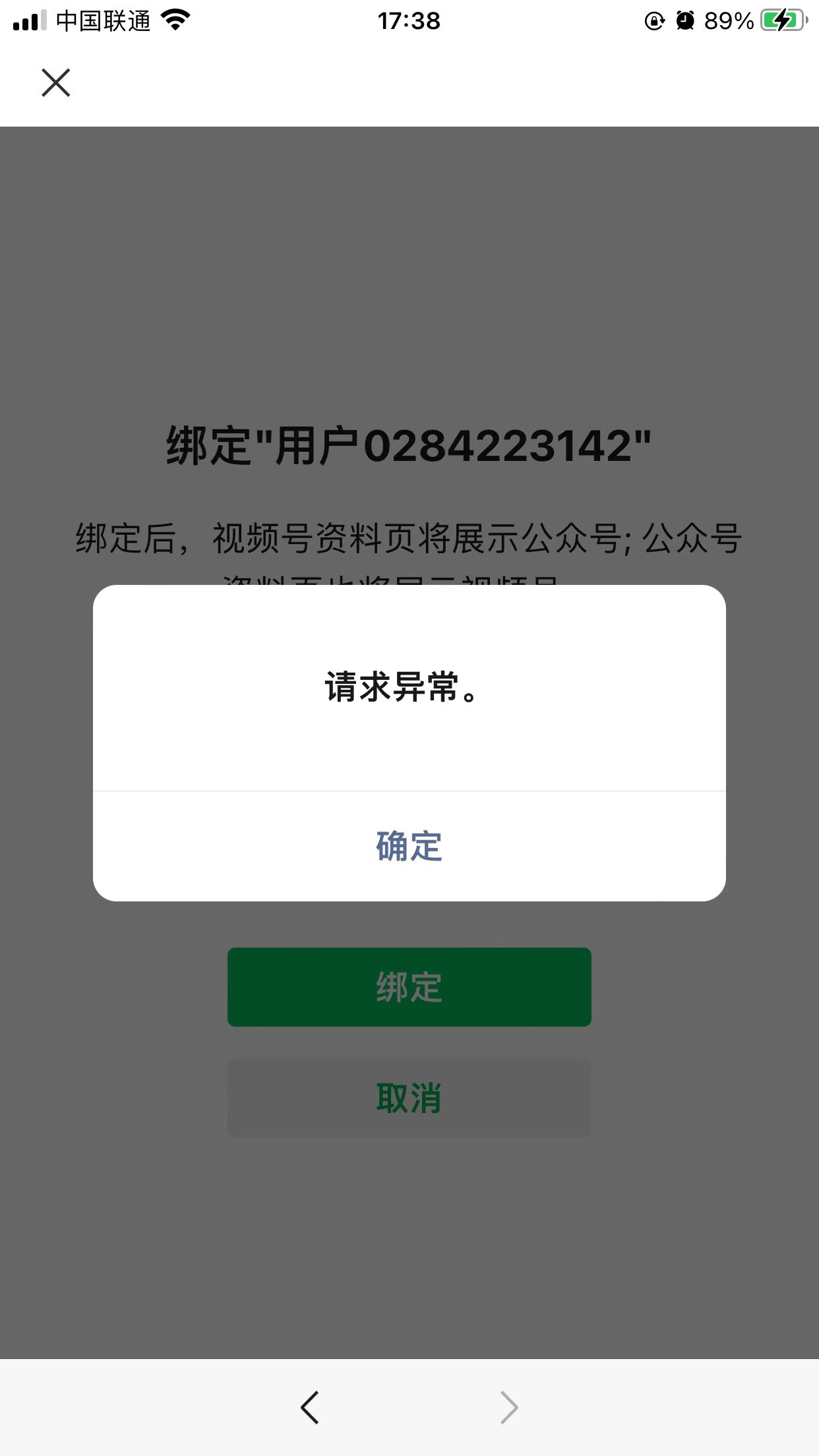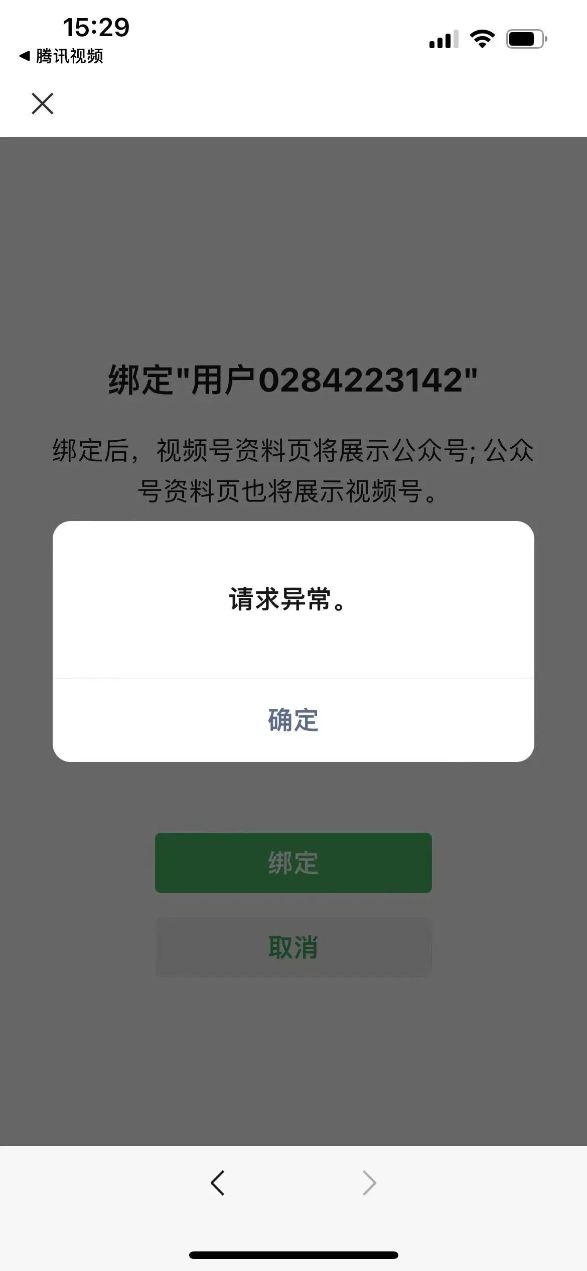 5. 问题描述:公众号绑定视频号的过程中,显示“请求异常”