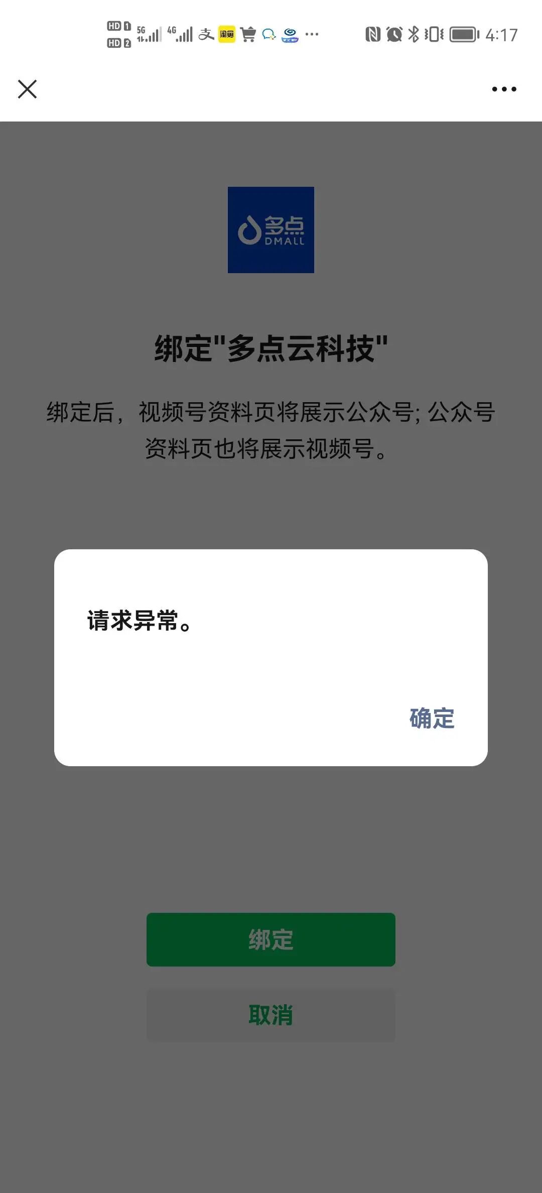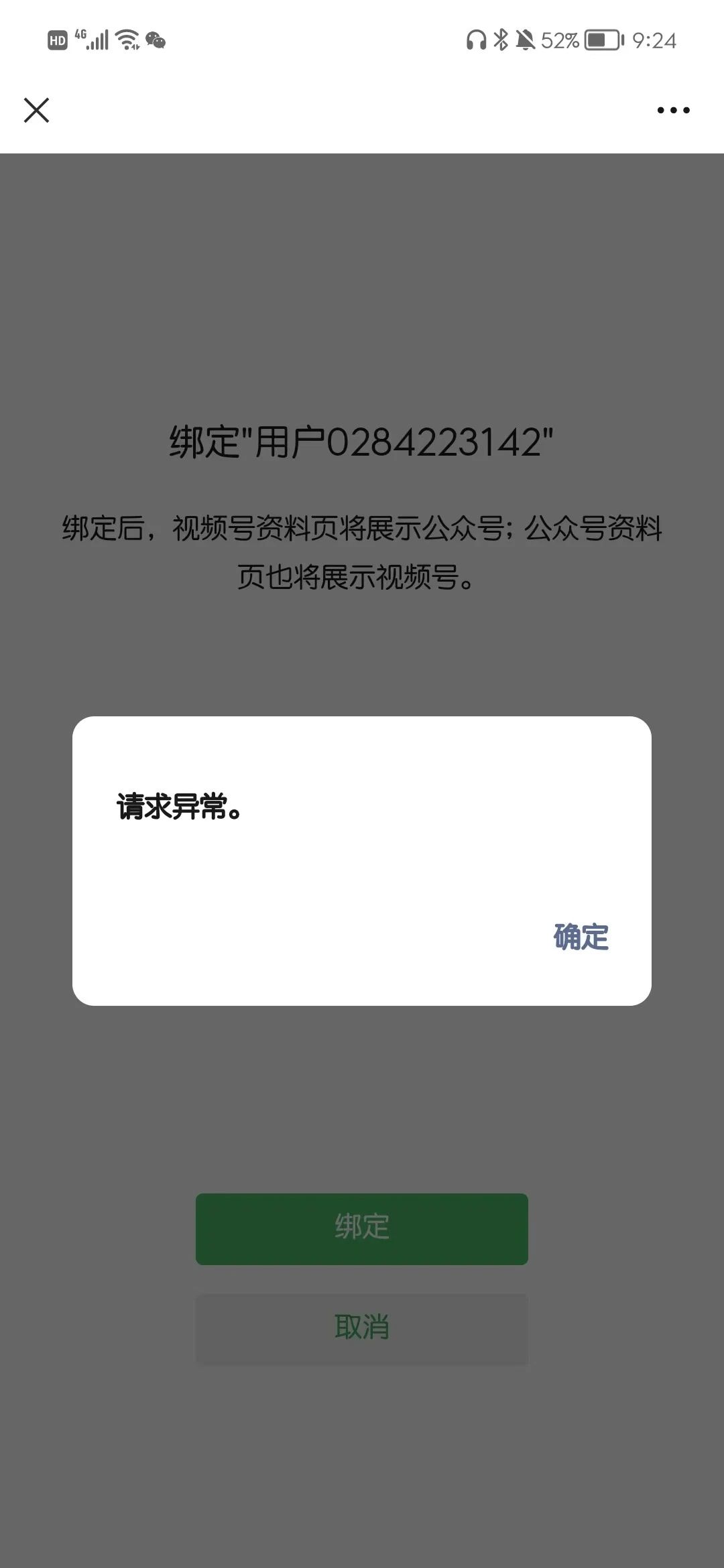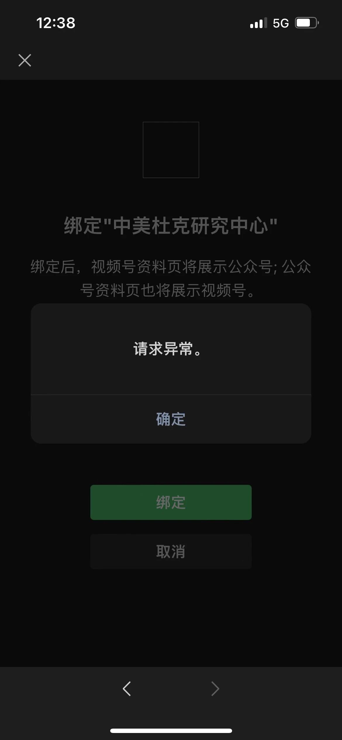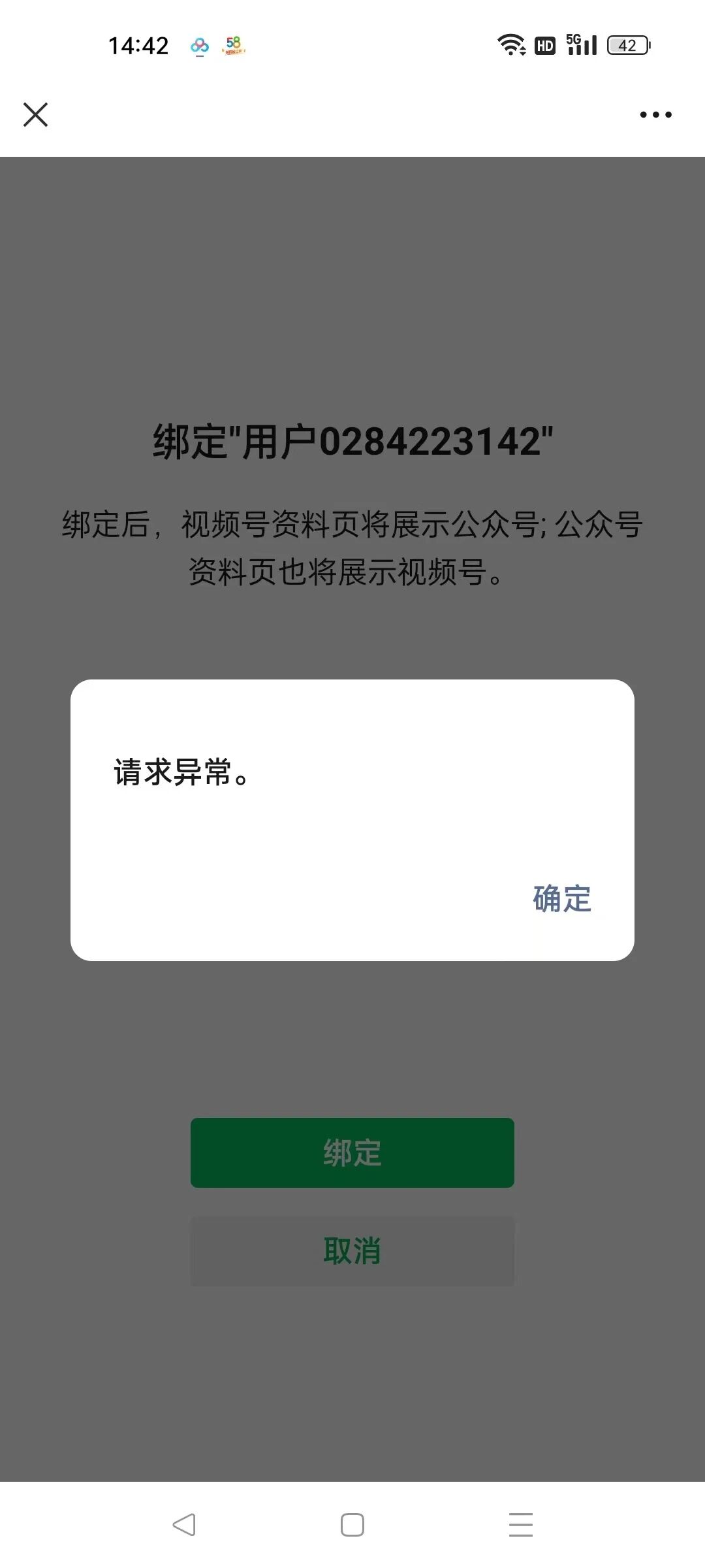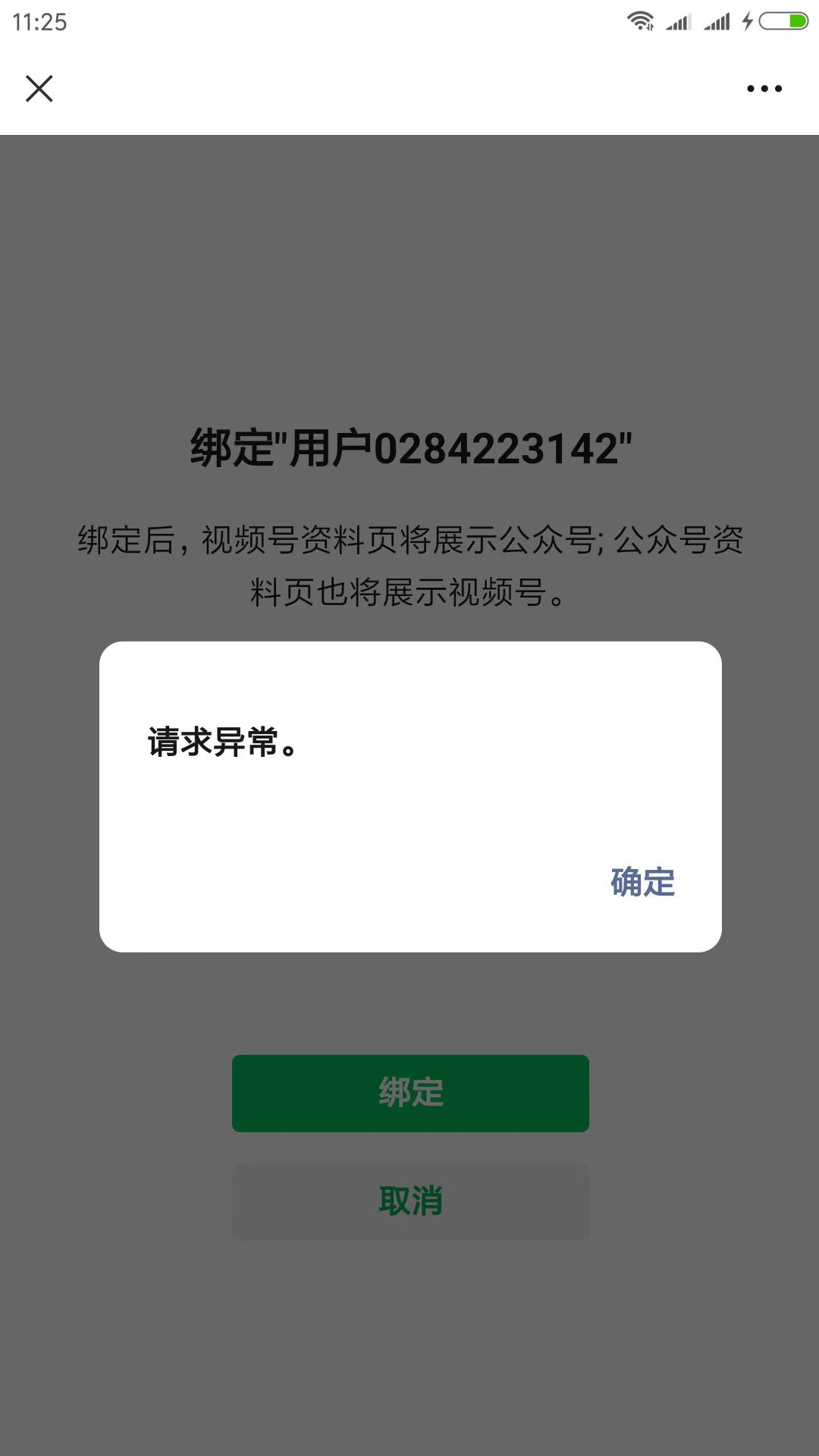 5. 问题描述:你好,目前我们的公众服务号不知道是怎么回事.绑定不了所需要的视频号,提示显示请求异常。