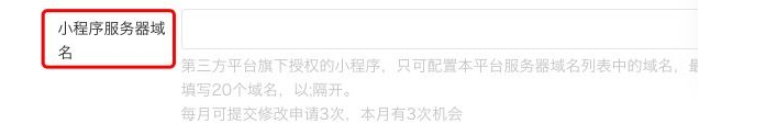 小程序服务器域名需要先将域名登记到第三方平台的小程序服务器域名中,才可以调用接口进行配置,但第三方小程序里面只有“小程序服务器域名” 和 “小程序业务域名”,没有上传域名;调用设置小程序服务器域名的接口只能设置requestdomain,其他的wsrequestdomain,uploaddomain,downloaddomain都设置不了