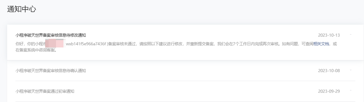你好,你的小程序( wxb141f5e966a7436f )备案审核未通过,请按照以下建议进行修改,并重新提交备案,我们会在7个工作日内完成再次审核。如有问题,可查阅相关文档,或在备案系统中咨询客服。