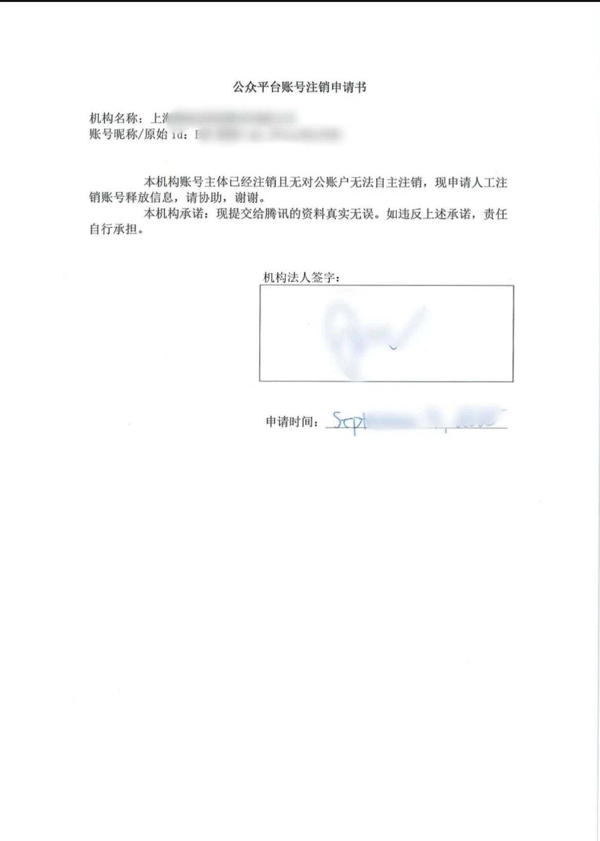 由于公众号的企业主体已经注销了,企业公章也已经回收了。因此按照要求提交了1)公司法人手写签字的【公众平台账号注销申请书】扫描件如图(按照打印文件、签字、扫描、上传扫描件的顺序流程),2)加盖登记机关公章的【注销登记通知书】。但是审核结果显示:“不通过,注销申请函需提供纸质版,若无公章请法人手写签字”。完全不理解审核什么意思?我们已经是按照要求提交的资料???审核反馈结果有问题。