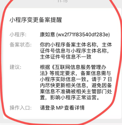 腾讯发来通知,说:你的小程序备案主体名称,主体证件号信息与小程序主体名称,主体证件号信息不一致,