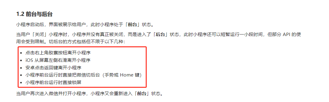 https://developers.weixin.qq.com/miniprogram/dev/framework/runtime/operating-mechanism.html#:~:text=%E5%89%8D%E5%8F%B0%E3%80%8D%E7%8A%B6%E6%80%81%E3%80%82-,1.3%20%E6%8C%82%E8%B5%B7,-%E5%B0%8F%E7%A8%8B%E5%BA%8F%E8%BF%9B%E5%85%A5