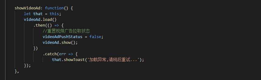 // 组件创建后会拉取一次广告,用户关闭广告后会去拉取下一条广告,因此这里直接show就可以,另外如果show失败增加一次重试策略rewardedVideoAd.show().catch(err => {returnrewardedVideoAd.load().then(() =>rewardedVideoAd.show())}).catch(err => {console.error('激励视频加载失败', err)})以上代码应该可以增加点击播放视频的反应时间,如果确实加载失败,请进行相应的用户提示,并根据错误信息在 https://developers.weixin.qq.com/minigame/dev/api/ad/RewardedVideoAd.onError.html 查看原因。