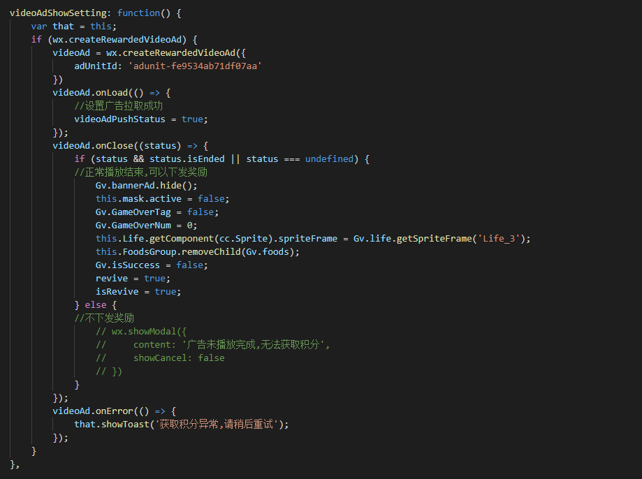 2、关于点击按钮没反应或者广告加载慢的问题,显示激励视频的代码可以参考下面这样写: