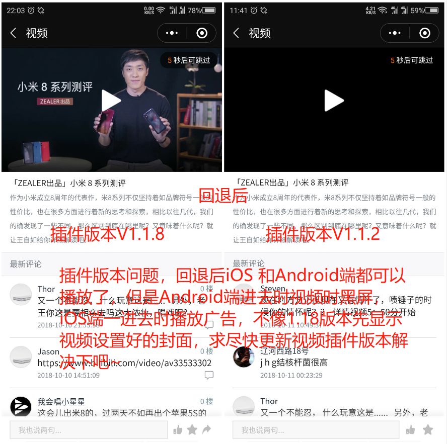我这遇到的问题倒不是关于腾讯视频插件的,而是小程序原生组件video,在iPhone播放时会卡住但时间线一直在更新,而Android手机则没什么问题。
