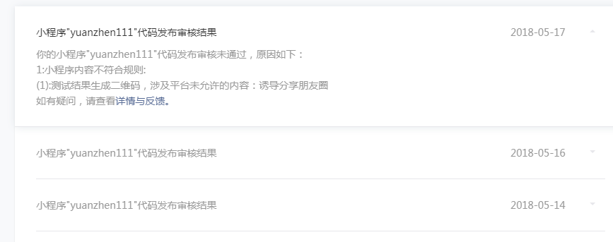 你的小程序"yuanzhen111"代码发布审核未通过,原因如下:1:小程序内容不符合规则:(1):测试结果生成二维码,涉及平台未允许的内容:诱导分享朋友圈如有疑问,请查看详情与反馈。