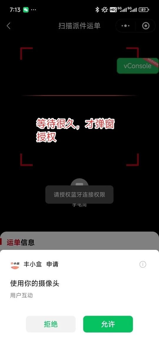 硬件管理小程序,需要调用蓝牙和相机权限,但是在弱网环境下,用户通过小程序连接设备时,需要等待很久才会弹出蓝牙授权,导致无法通过蓝牙连接设备。