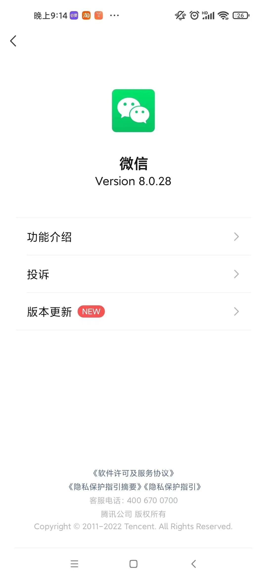 3. 微信版本号(微信-我-设置-关于微信-点击微信logo-截图):V8.0.25