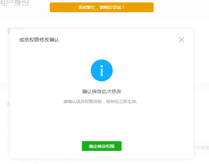 成员管理,不管是修改权限还是新增体验用户,每次都是系统繁忙,请稍后重试。