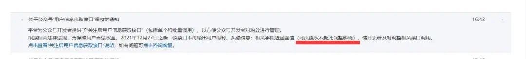 组件名称:https://api.weixin.qq.com/cgi-bin/user/info 问题:12月27日之后可以通过什么api获取昵称,或者是微信公众号获取用户信息做了规则调整,后续要如何来做才可以获取到用户的昵称信息