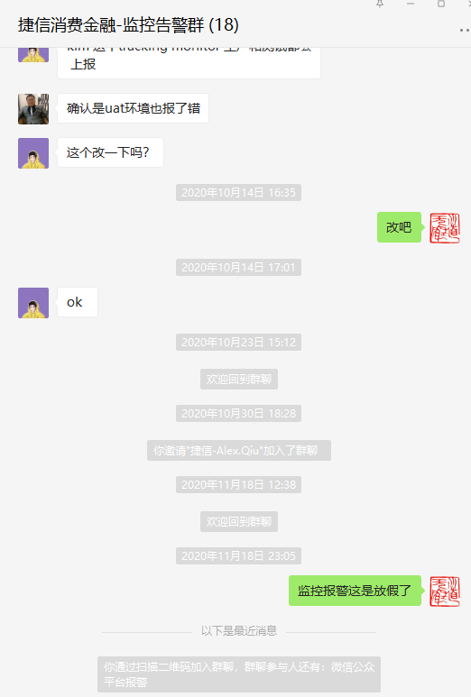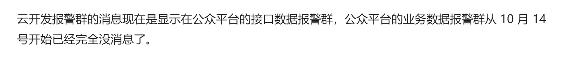 云开发报警群的消息现在是显示在公众平台的接口数据报警群,公众平台的业务数据报警群从 10 月 14 号开始已经完全没消息了。