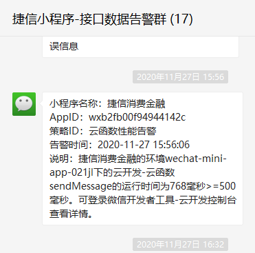 公众平台的接口数据报警群和业务数据报警群,还有一个开发者工具上面设的云开发告警群。