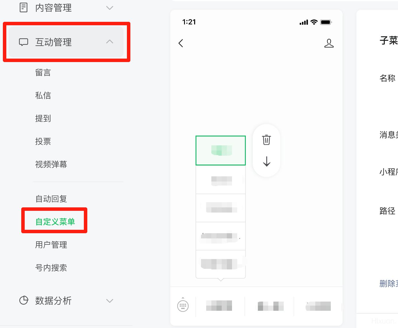 请问是指自定义菜单功能吗?如果是的话,在后台【互动管理】菜单这里。