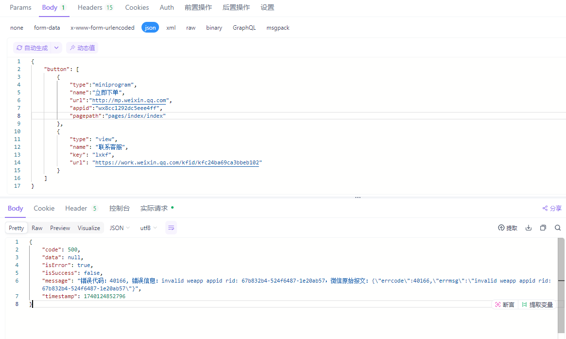 {"button": [{"type":"miniprogram","name":"立即下单","url":"http://mp.weixin.qq.com","appid":"wx8cc1292dc5eee4ff","pagepath":"pages/index/index"},{"type": "view","name": "联系客服","key": "lxkf","url": "https://work.weixin.qq.com/kfid/kfc24ba69ca3bbeb102"}]}我们配置,都说正确的,但是你这个报错信息就是说你的appid无效,你检查一下小程序,是不是不能正常使用了