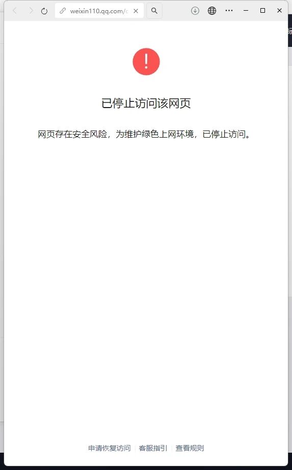 但是微信打开就是显示,网页存在安全风险,为维护绿色上网环境,已停止访问。麻烦解除拦截恢复可直接在微信内访问该网站谢谢审核大人.