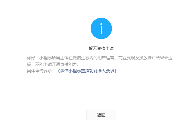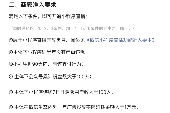 参考一下条件和准入说明https://developers.weixin.qq.com/community/develop/doc/0008ce654c4450244c1a7e5de5b801?highline=%E5%B0%8F%E7%A8%8B%E5%BA%8F%E7%9B%B4%E6%92%AD%E5%87%86%E5%85%A5