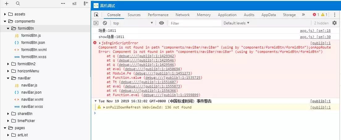然后真机调试,提示找不到组件,如图: