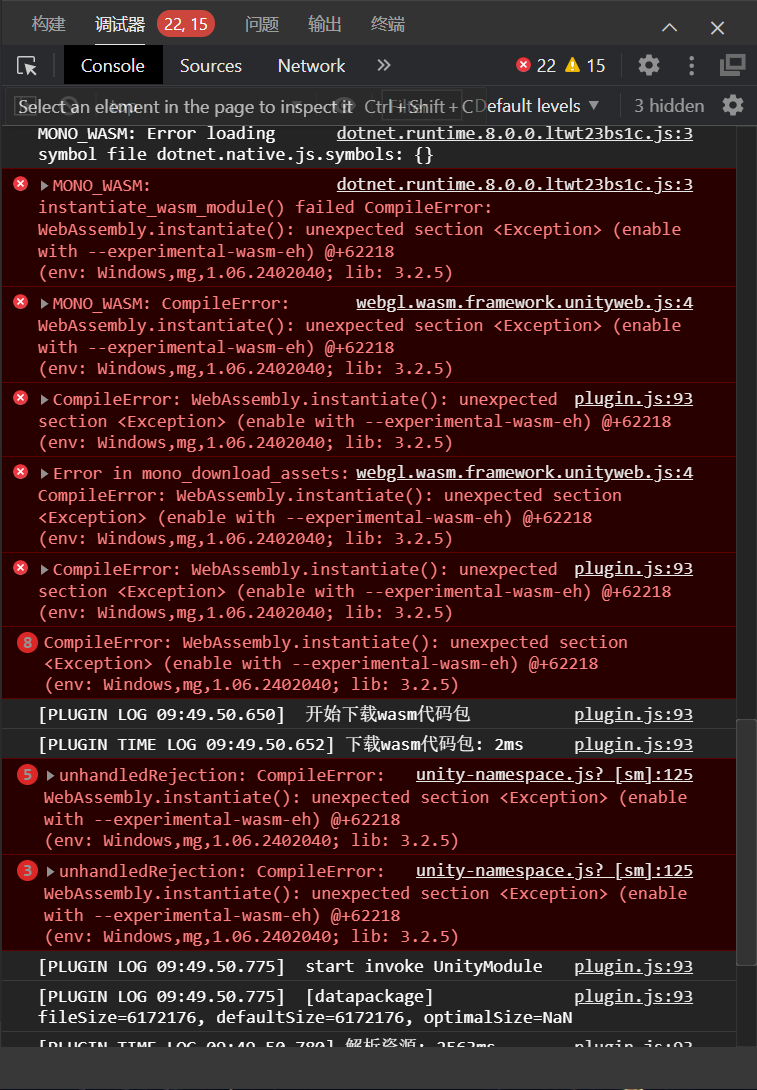 plugin.js:93 CompileError: WebAssembly.instantiate(): unexpected section <Exception> (enable with --experimental-wasm-eh) @+62218(env: Windows,mg,1.06.2402040; lib: 3.2.5)