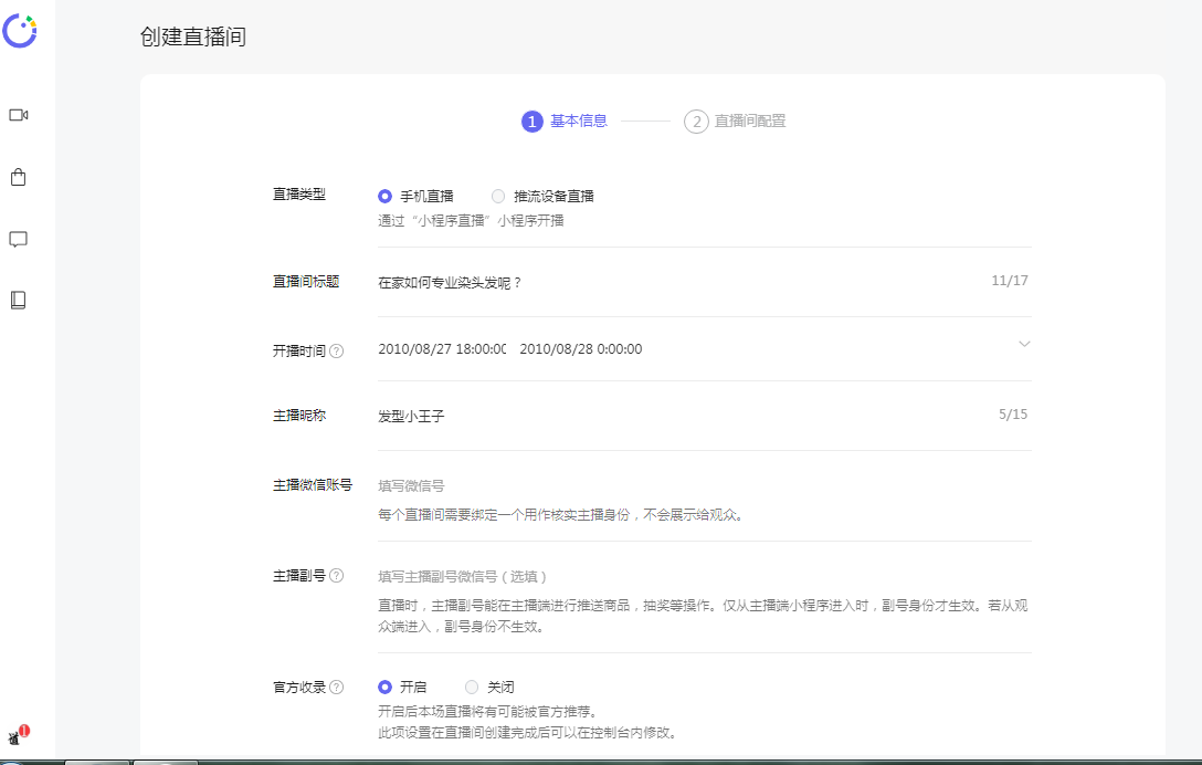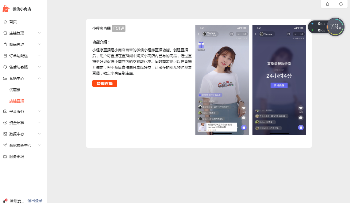 你好,成功开通的小商店(企业&个体工商户)自带直播能力,商家只需同时满足已开张、且商品库中有成功发布的商品,后台的直播页面将会自动开通直播功能,商家点击管理直播跳转到直播管理后台,可创建直播间、指定主播、设定直播开播时间。请确认同时满足已开张、且商品库中有成功发布的商品,并刷新/更换浏览器重新尝试,如问题仍存在,请私信提供appid及实时问题页面截图。