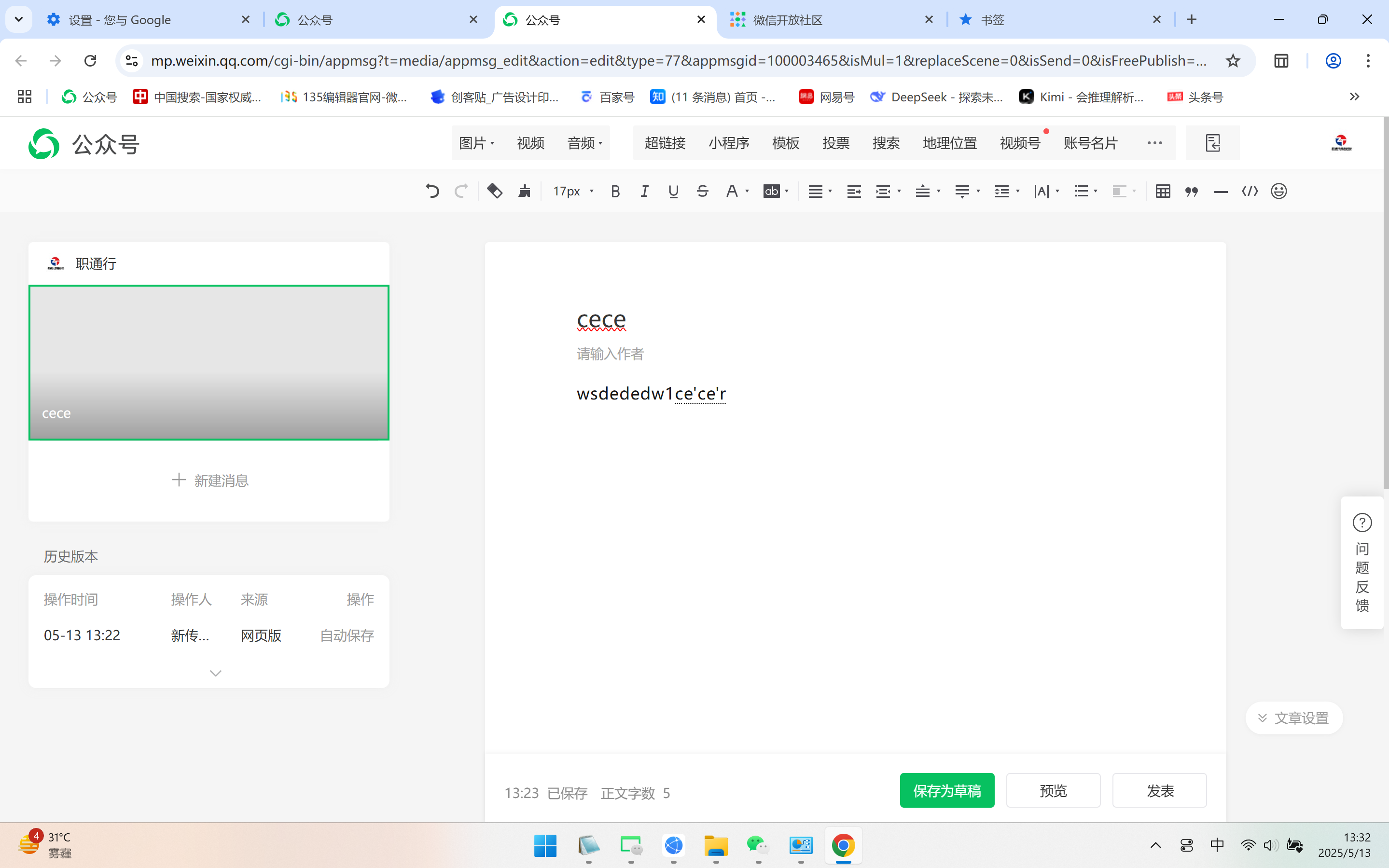 【问题描述】: 新建文章无法输入中文,我尝试更换账号,清空缓存卸载谷歌浏览器也无法正常输入中文,甚至连微信开放社区也无法输入中文。我最后尝试更换谷歌浏览器,就正常可以输入了,请官方帮忙排查下,抓紧适配。如下图,系统是win11, 谷歌浏览器最新版,补充下输入法用的是微软自带的输入法,之前一直都是正常的