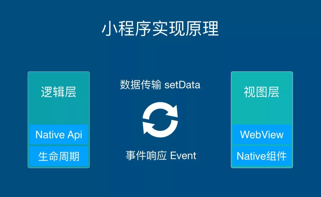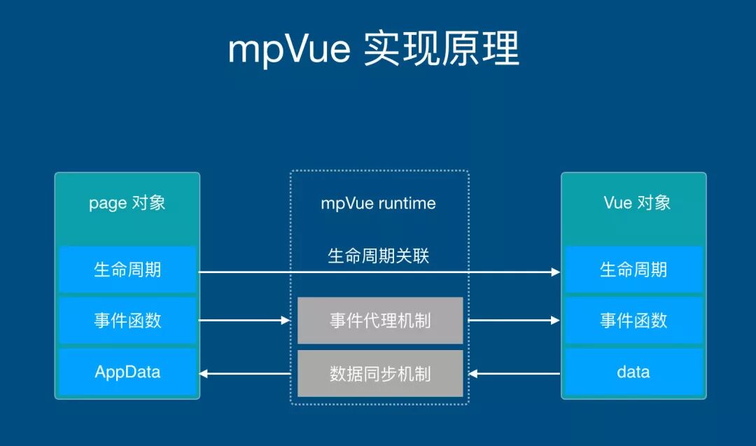 生命周期关联:生命周期和数据同步是 mpvue 框架的灵魂,Vue.js 和小程序的数据彼此隔离,各自有不同的更新机制。mpvue 从生命周期和事件回调函数切入,在 Vue.js 触发数据更新时实现数据同步。小程序通过视图层呈现给用户、通过事件响应用户交互,Vue.js 在后台维护着数据变更和逻辑。可以看到,数据更新发端于小程序,处理自 Vue.js,Vue.js 数据变更后再同步到小程序。为实现数据同步,mpvue 修改了 Vue.js runtime 实现,在 Vue.js 的生命周期中增加了更新小程序数据的逻辑。