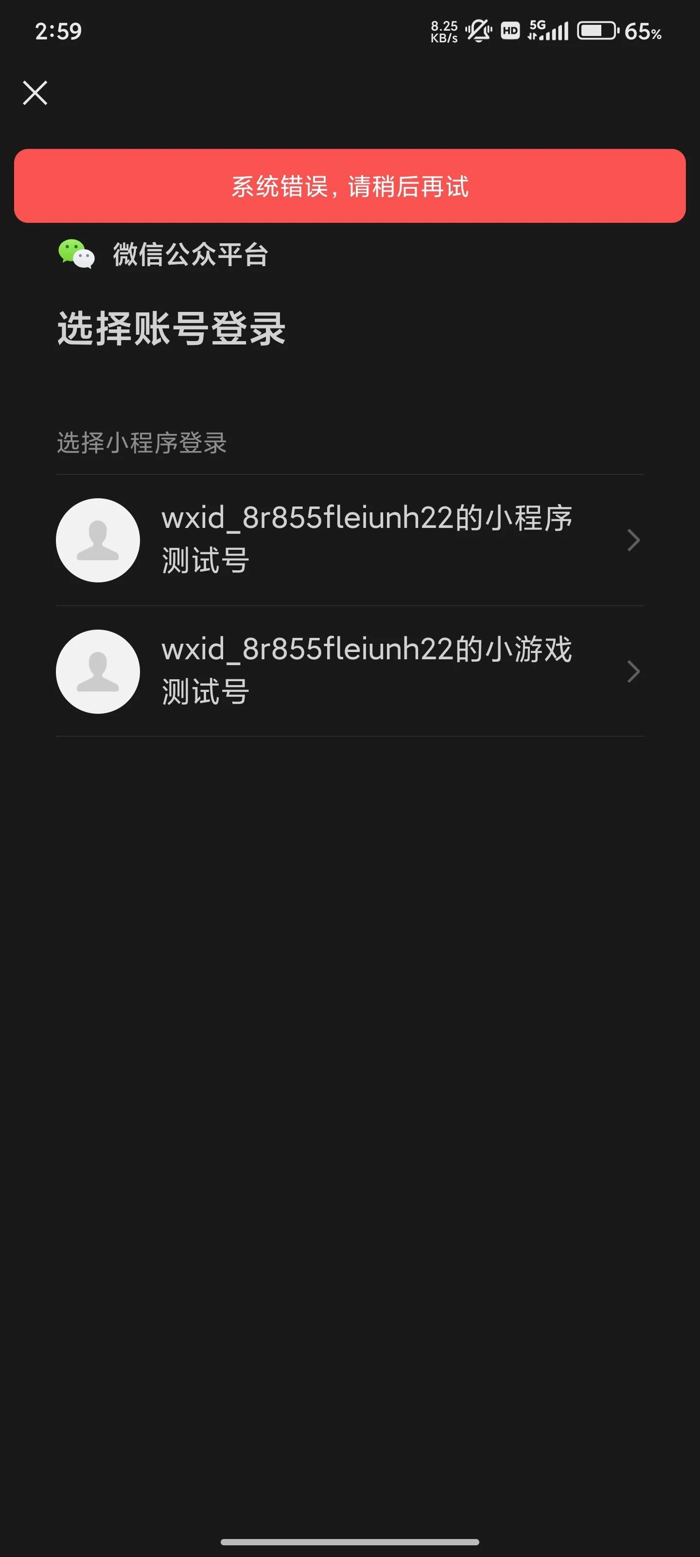 扫码登录小程序测试号,一直显示系统错误,换了设备和浏览器都不行,着急求助