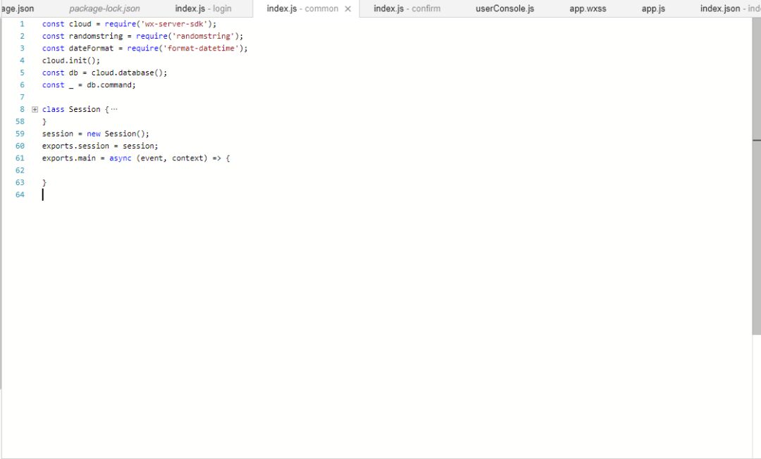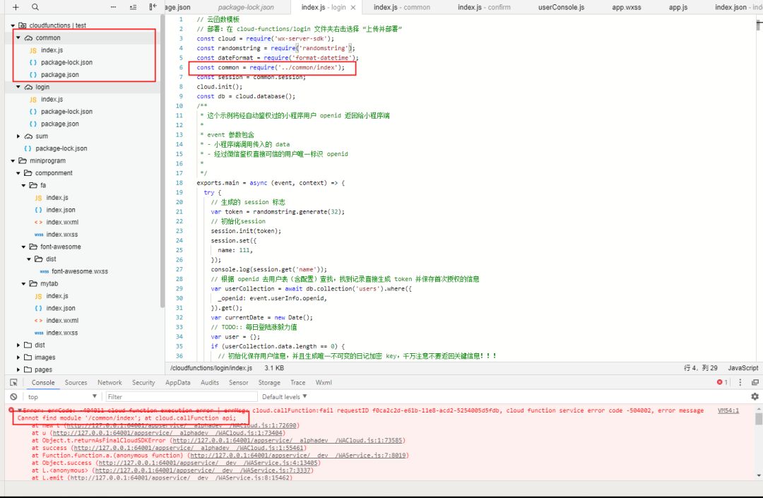 我想封装一些公共的方法给所有云函数使用,于是尝试在 cloudfunctions 中新增了一个 common 文件夹,并以云函数的形式部署了上去,然后在 login 文件夹下的云函数中使用 requere('../common/index') 尝试引入 common/index,结果发现云函数报错。