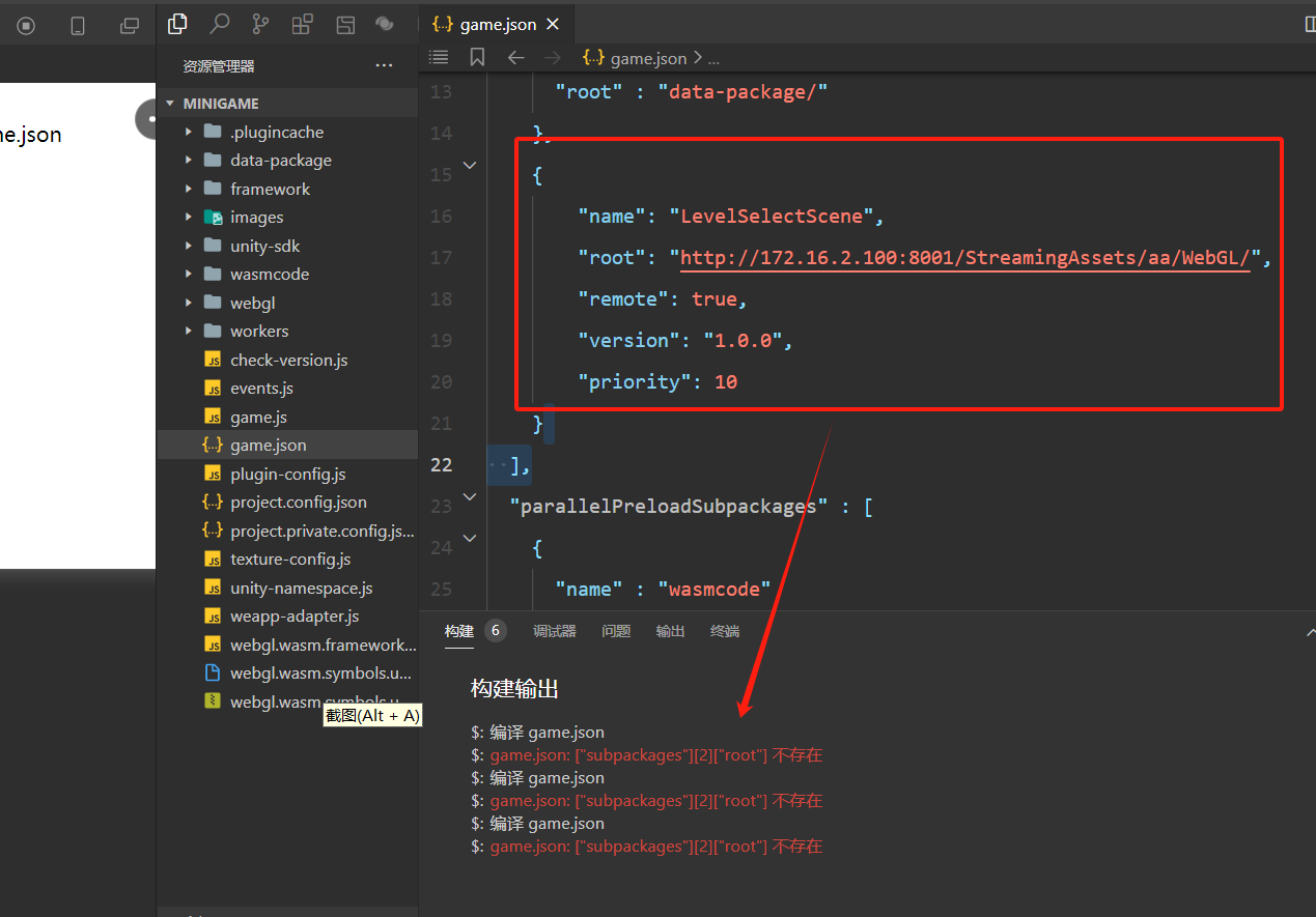 2、minigame 的game.json文件配置分包资源,一直报错:game.json: ["subpackages"][2]["root"] 不存在,相关子包也无法下载,这个是怎么回事呢,请哪位大神看看是哪里配置不对吗?