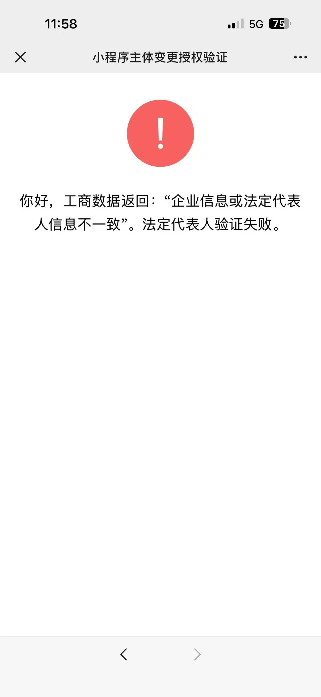 小程序首次认证后,原法人A离职,公司法人变更为B。后续公司名称也变更后,只是更新了小程序备案,未更新小程序主体认证。收到小程序备案主体(现公司名称)与小程序主体(原公司名称)不一致的提醒,进行小程序主体变更时,法人B同为原主体法人和目标主体法人,但是原主体法定代表人扫码验证无法通过,这是什么原因?应该怎么办?