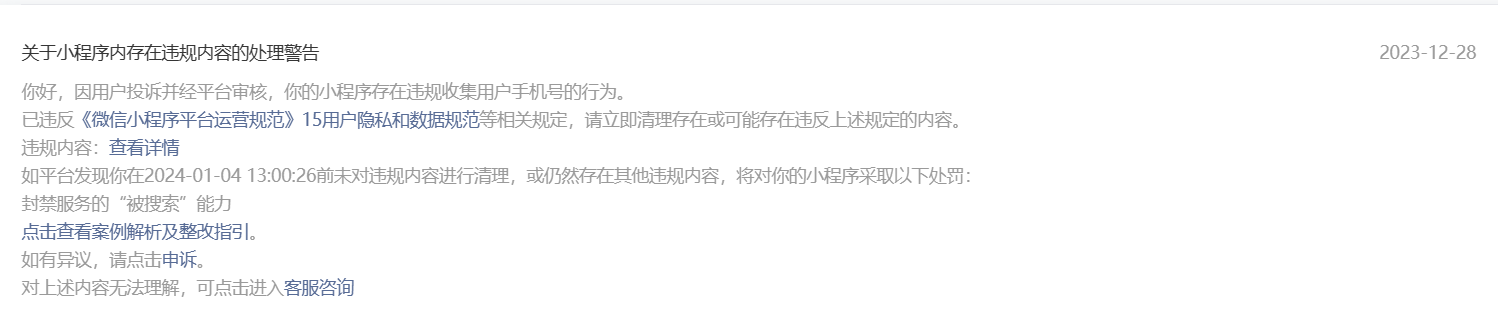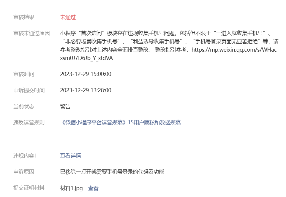 具体违规内容为手机号验证码登录,这边于2023-12-29 13:28:00修改完成并提交申诉,整体移除了手机号登录功能审核结果为未通过: