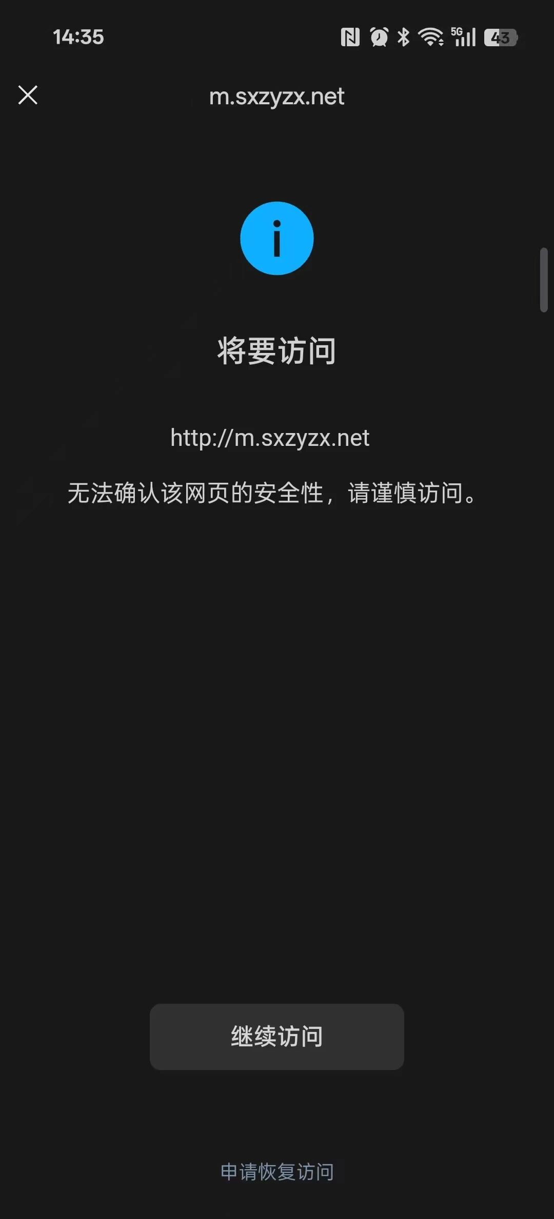 您好,域名sxzyzx.net在西部数码注册并备案通过,http://m.sxzyzx.net/浏览器访问正常,我是网站开发者,访问时间如图2026/3/9,点开网址提示“无法确认该网页的安全性,请谨慎访问。”经检查网页里没有不安全的内容,请核实后帮忙解除拦截,谢谢!尽快处理,急急急,现在需要打开使用,谢谢!