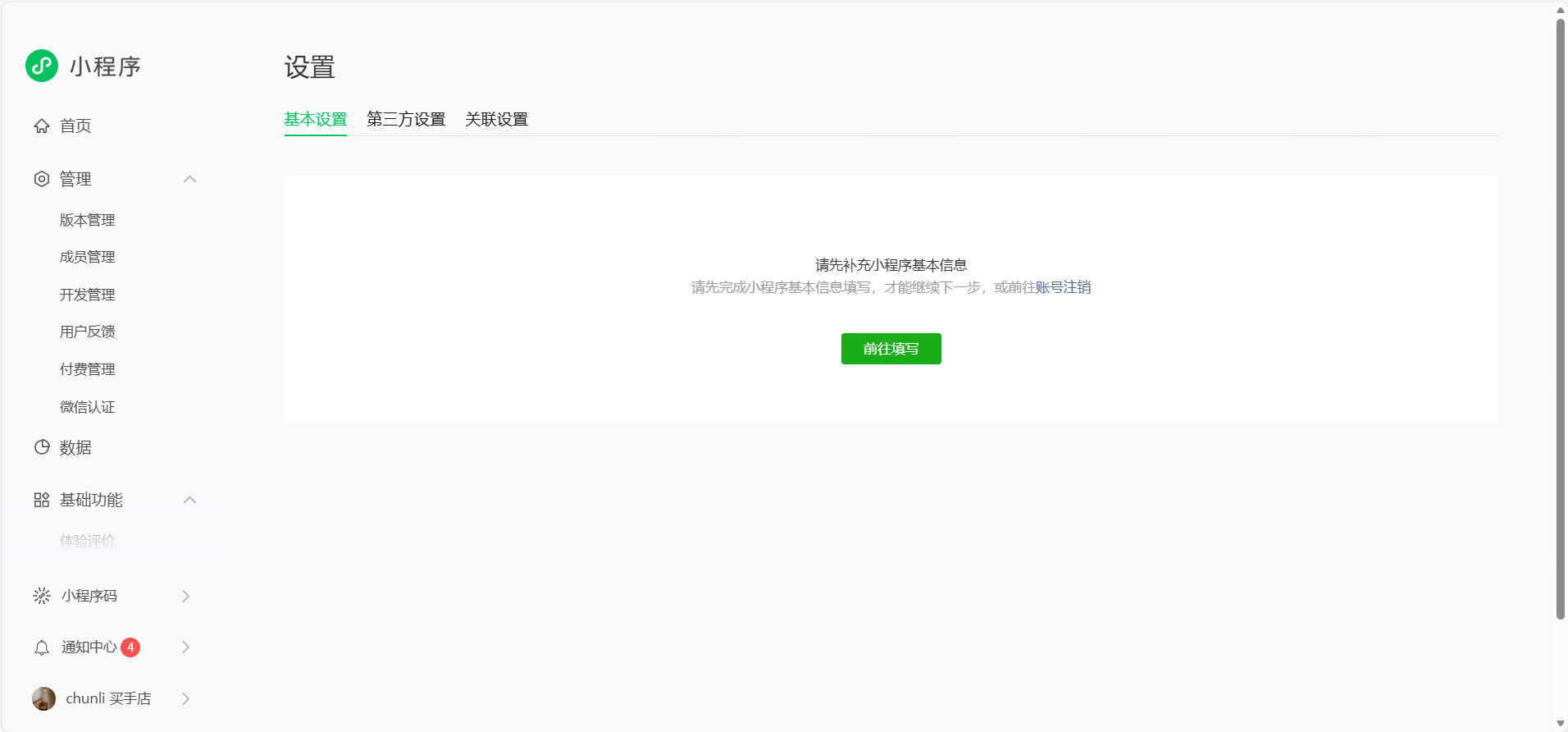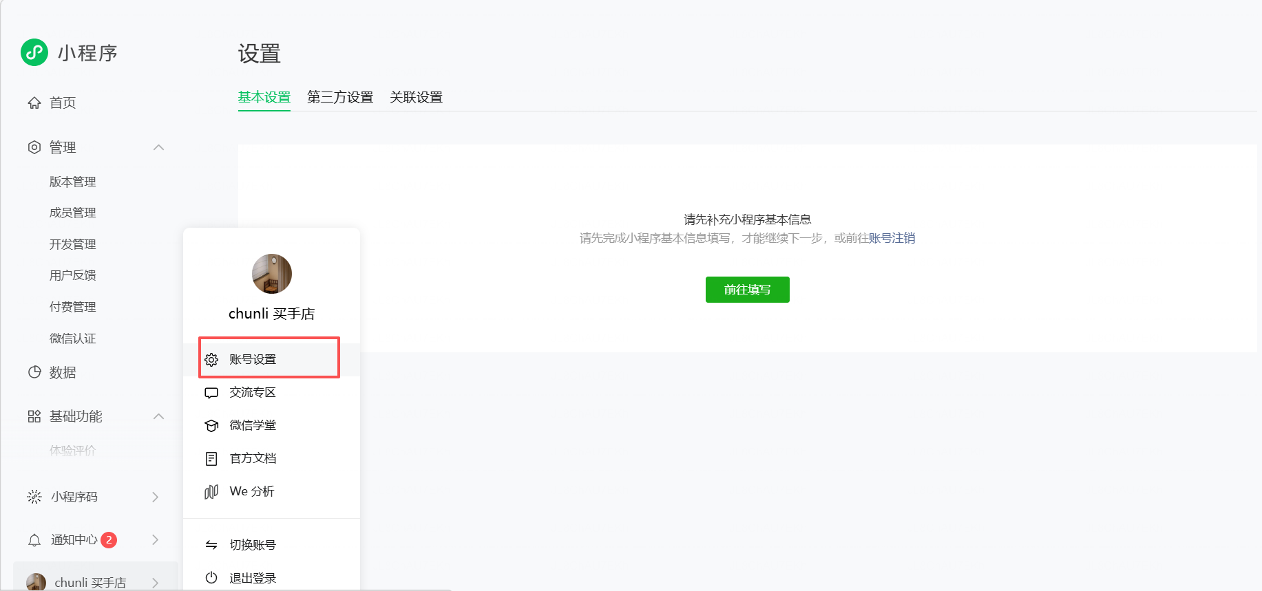 想修改小程序昵称,点击账号设置,界面显示请先补充小程序基本信息,点击前往填写,又会回到小程序发布流程界面,没找到地方修改小程序昵称