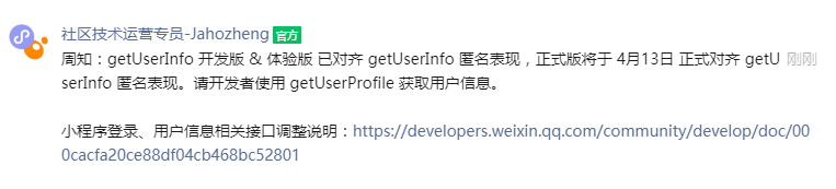 周知:getUserInfo 开发版 & 体验版 已对齐 getUserInfo 匿名表现,正式版将于 4月13日 正式对齐 getUserInfo 匿名表现。请开发者使用 getUserProfile 获取用户信息。
