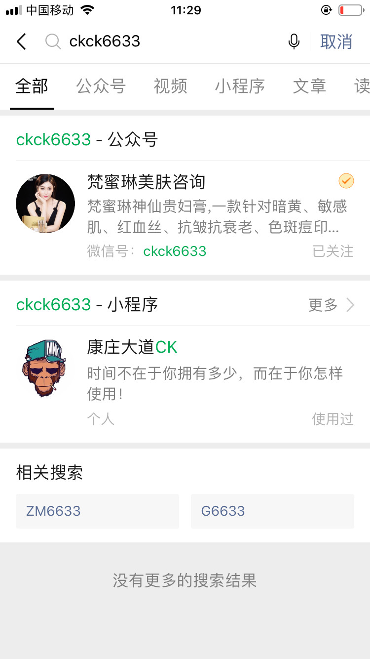这个康庄大道CK不是你们的小程序吧,我这里不是很明白你的诉求,你现在的疑问是:为什么搜索ckck6633会出现康庄大道CK这个小程序么?