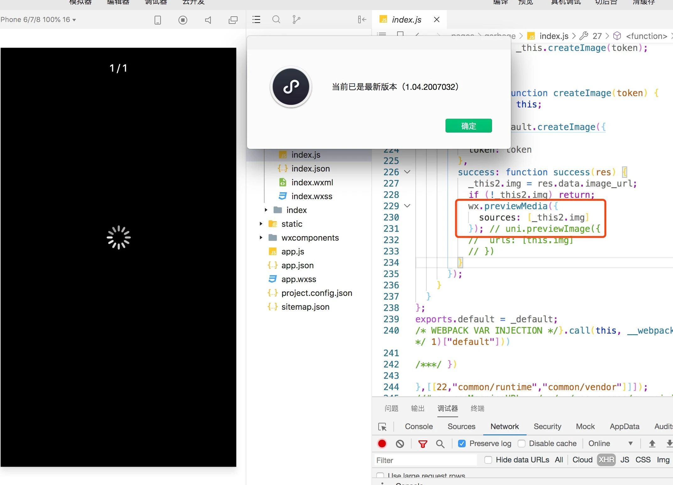 开发者工具调用 wx.previewMedia 一直转啊转 一直出不来 好似有爱的魔力,如下图:
