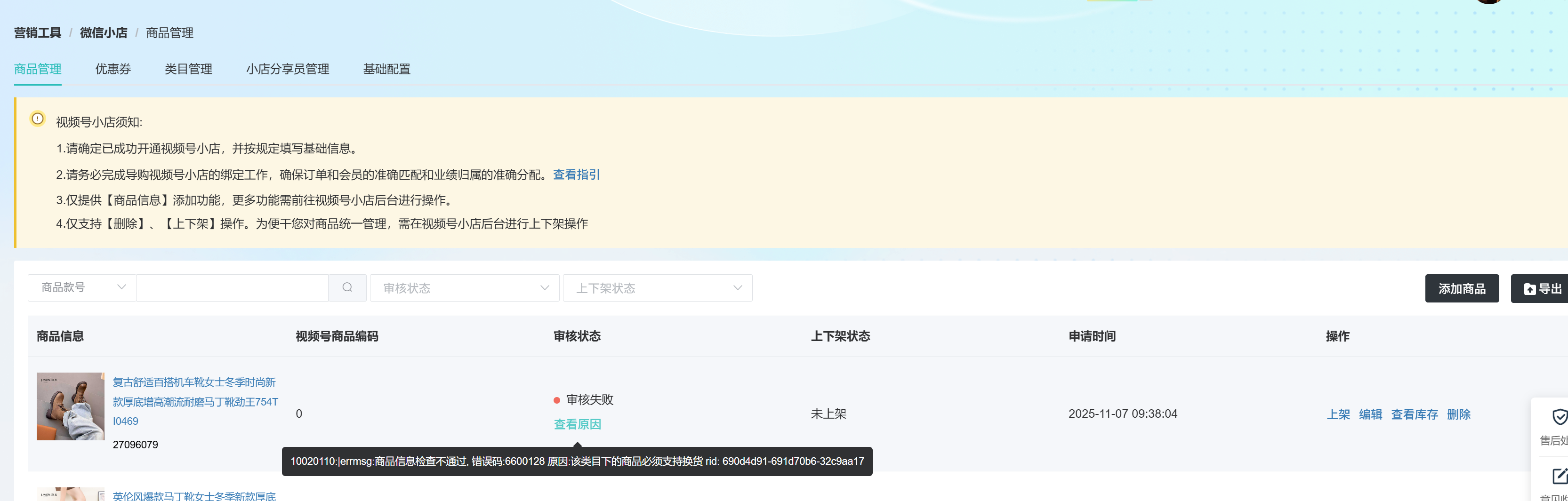 结果:{"errcode":10020110,"errmsg":"商品信息检查不通过, 错误码:6600128 原因:该类目下的商品必须支持换货 rid: 690d4d91-691d70b6-32c9aa17"}