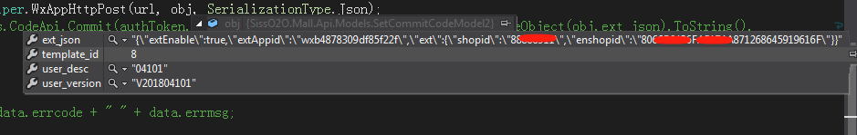 "ext_json":{"extEnable":false,"extAppid":"wxf85f22f","ext":{"shopid":"8066B5174645919616F","enshopid":"8911"}},"user_version":"V1.0","user_desc":"小程序测试2018-04-09 10:45:58"