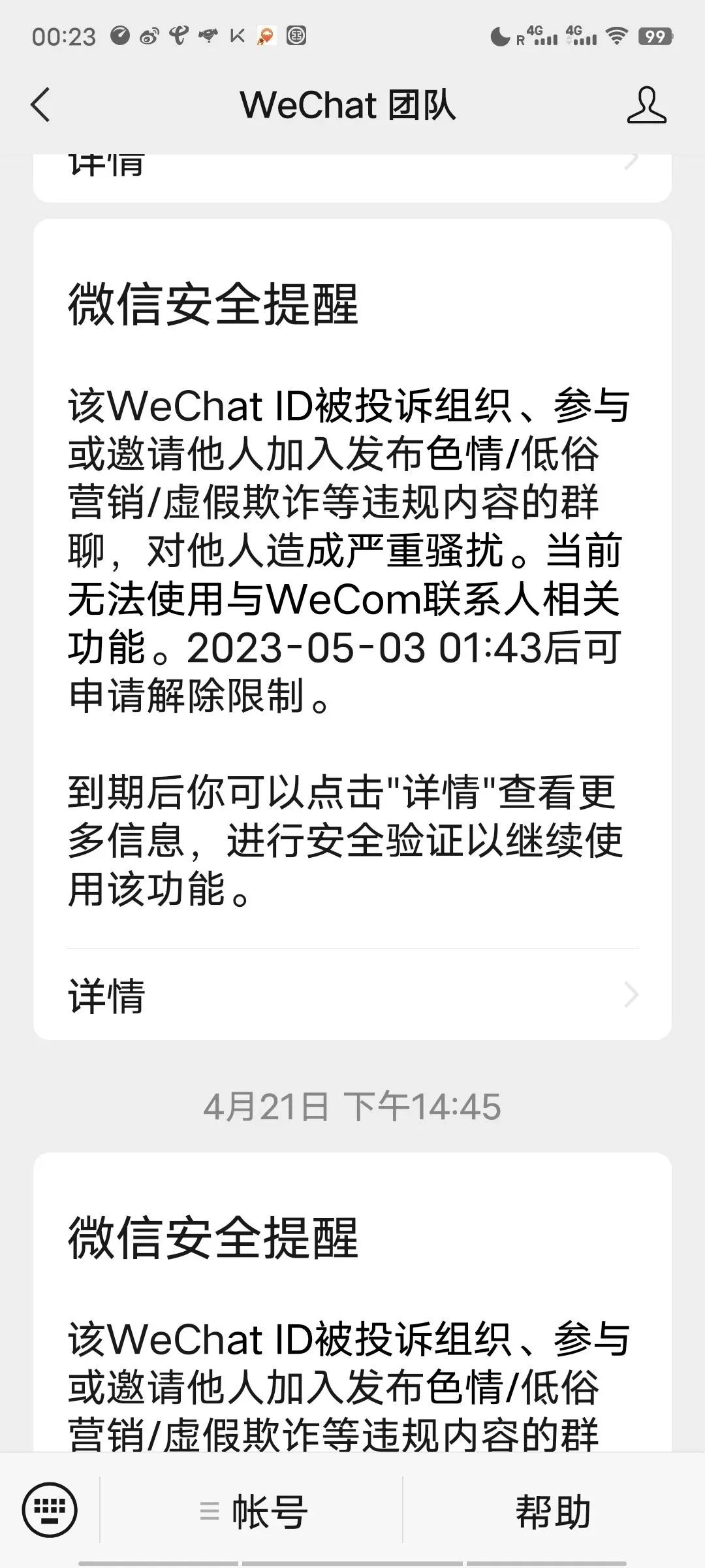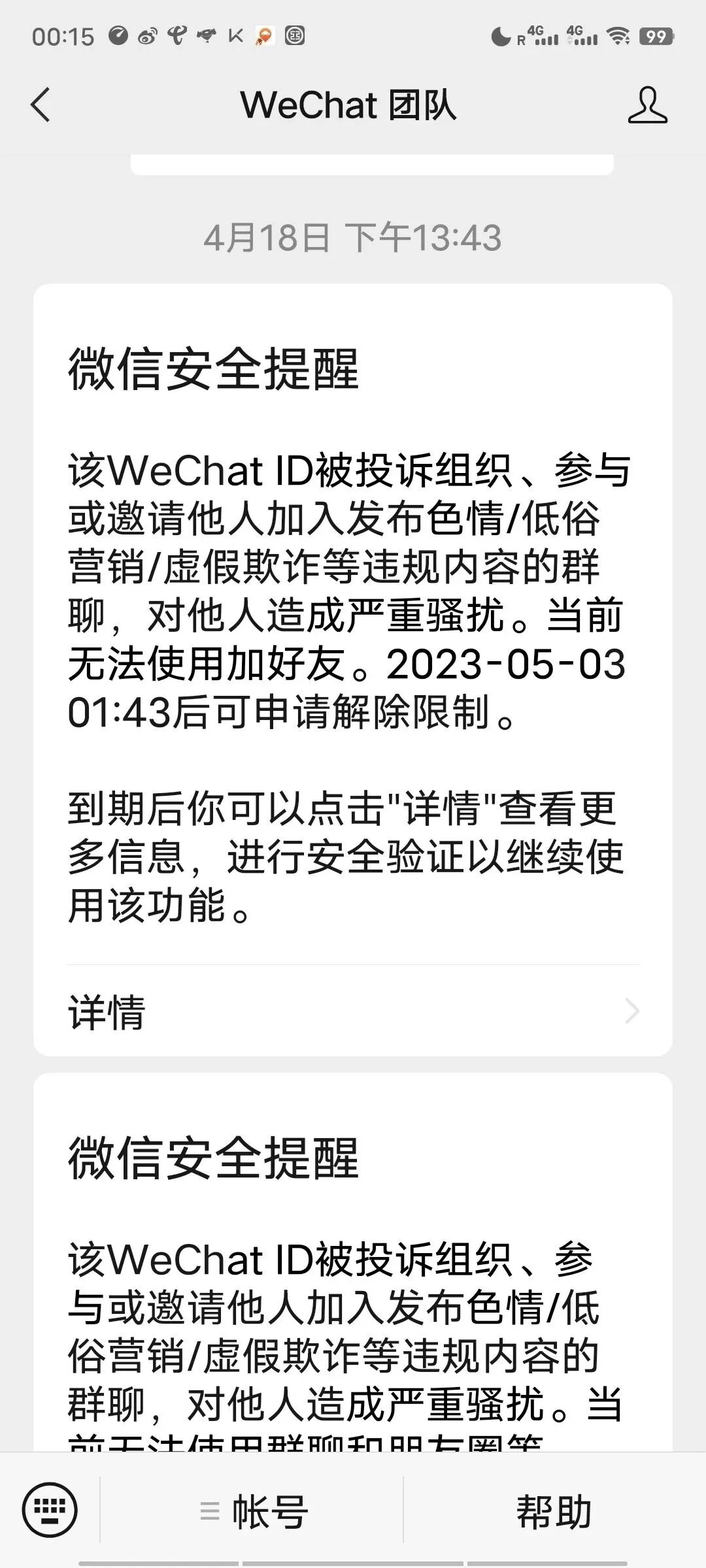 我现在居住在加拿大,日常使用号是海外wechat号,18号被投诉说我组织参与了什么色情低俗营销以及欺诈的群聊,封我的群功能,加好友功能,朋友圈功能15天到5月3号,我感到一头雾水,觉得是不是微信扫描错人了。结果三天后,21号几乎同一时间又以同样的理由封我这些功能15天到6号。我就怀疑被人循环恶意投诉了。24号,三天后,果然再次通知以同样理由封我功能15天到9号。请问,腾讯微信后台难道不进行核查和比对吗?如果一个截图能反复投诉吗?而且我已经六天连群聊功能都没有了,我又到哪里去组织参与什么低俗群聊呢?如果这样,是不是那个人或那些人没事每三天重复举报一次,我就要永远被封禁下去?给腾讯客服电话打电话也说无法接通,请问还能如何投诉?用wechat号登录这里提问还要我绑定国内银行卡,也没法发言。只好用我原来国内的微信号重新登录。现在这种情况被反复循环恶意举报怎么办?腾讯哪个部门可以投诉?难道只能找律师走法律程序了吗?我的wechat ID 是 tudoupian8866.