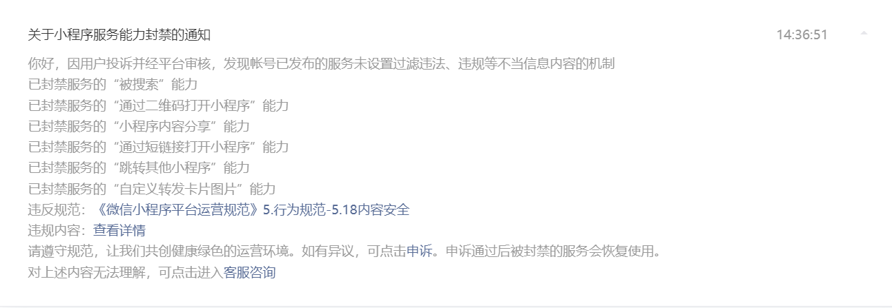 你好,平台对于违规小程序的处理是根据实际具体情况进行评估。如果对平台处理存在异议可发起线上申诉,会有专人处理。