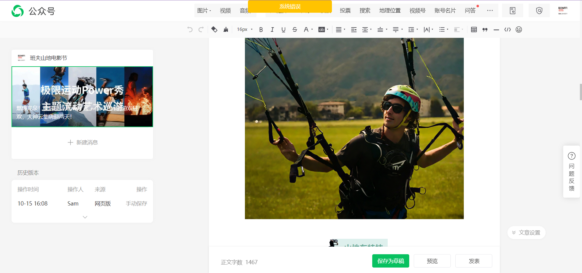 我在用公众号班夫山地电影节转载公众号青瓷古道的文章(已开通白名单),但是对图片有进行调整,发布时显示系统错误,无法群发