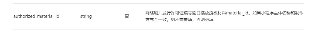 你好,感谢你的反馈,此字段已修正为【剧目播放授权材料material_id】。目前未提供剧目播放授权模板,你可自行提供有效的授权书,授权内容包括但不限于授权方、制作方、授权剧目信息等(需加盖双方主体公章)