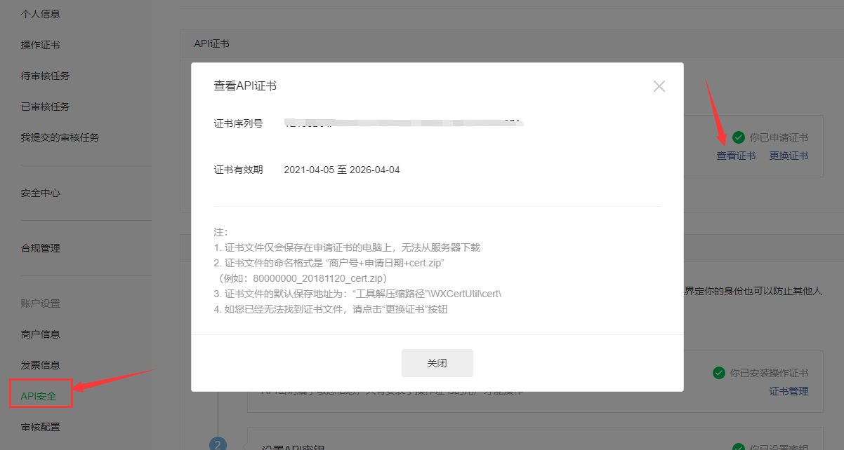 在走到提交申请单的时候,返回证书序列号的错误问题,当我从微信商户平台里获取证书序列号,获取步骤如图: