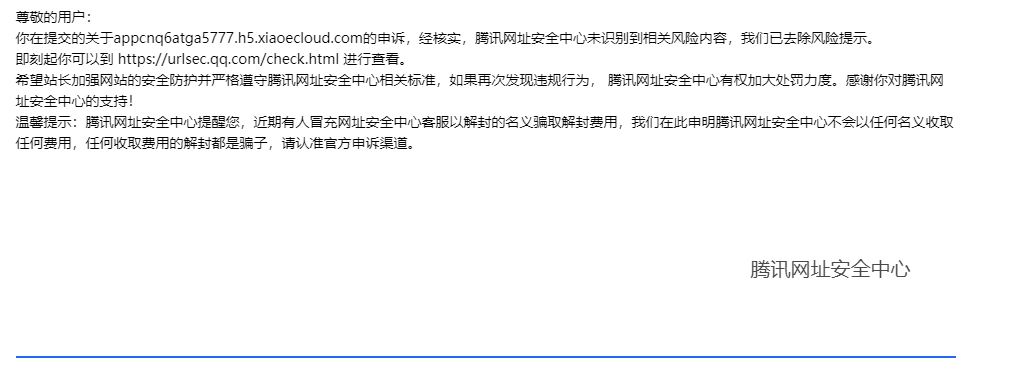 @微信朋友圈&外链咨询 请问下,这块在"网址安全中心"申诉已经成功了,也回邮件说没问题的了。为什么现在访问还是报这种警告的呢?能处理下吗?谢谢。