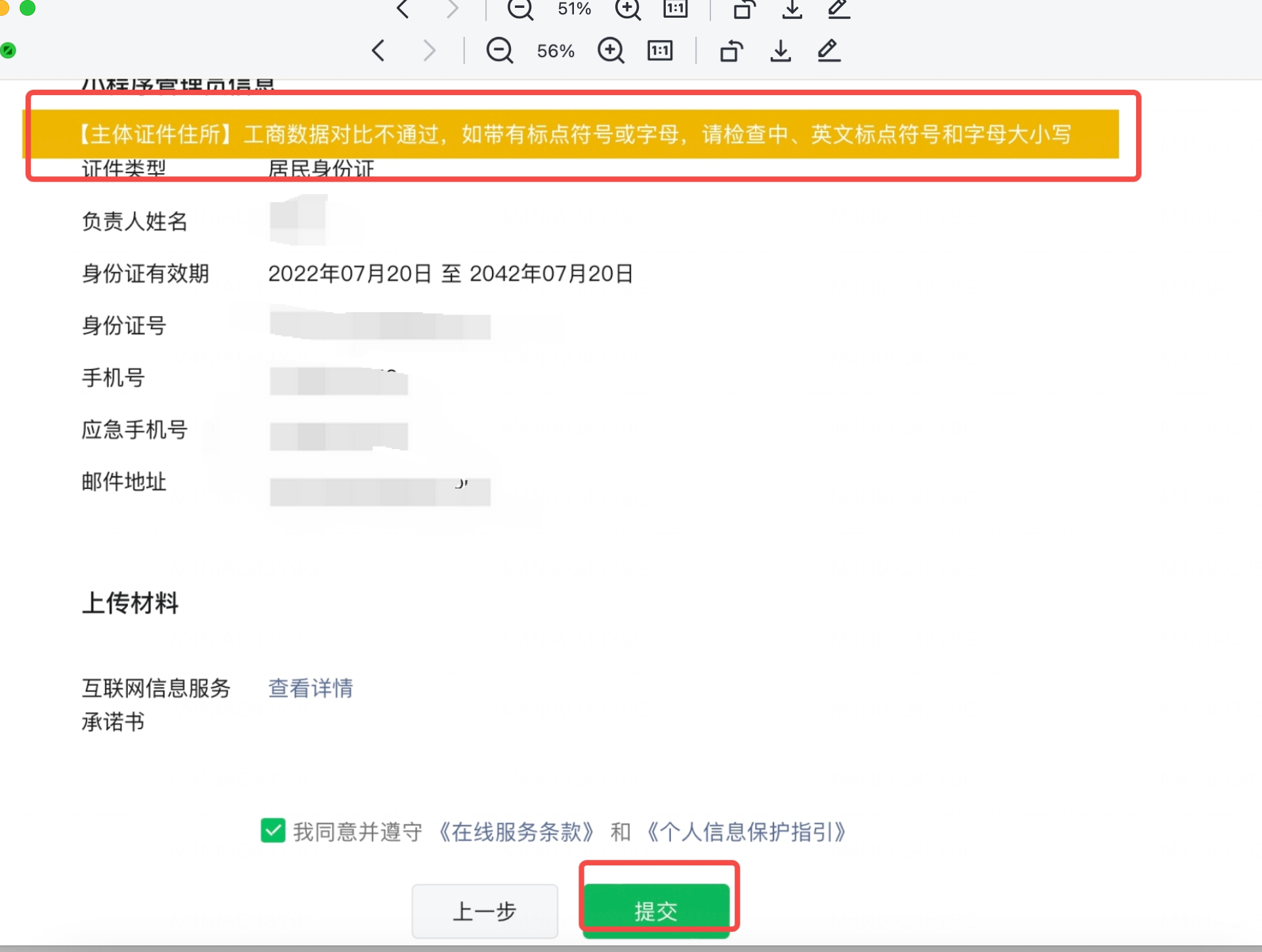 问题:在进行小程序备案,因为同一个主体下另个小程序已备案,选择复用资料备案,完成最后一步,提交不上去,总是提示主体证件住所问题,但填的明明是正确的。