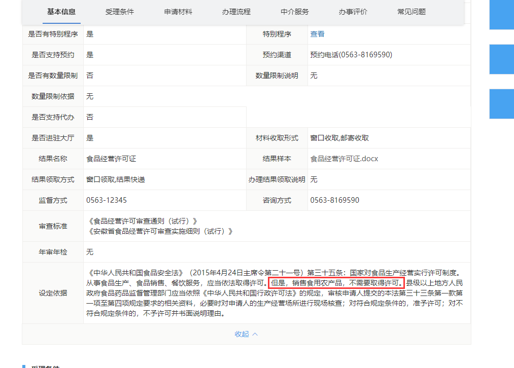 然后我就去政府官网截图了办理食品经营许可证的相关说明,如下