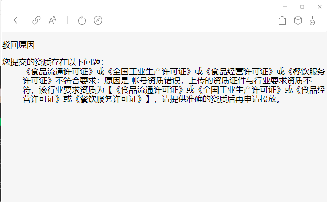 经过多次上传审核后,在排除其他问题后仍然被打回,理由仍然是未上传食品经营许可证